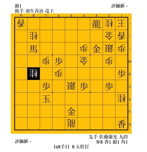 168手目 △8五桂打以下は▲8六王 △8九龍 ▲8八歩打 △同龍 ▲8七歩打 △9七龍 ▲8五王 △9五龍まで。