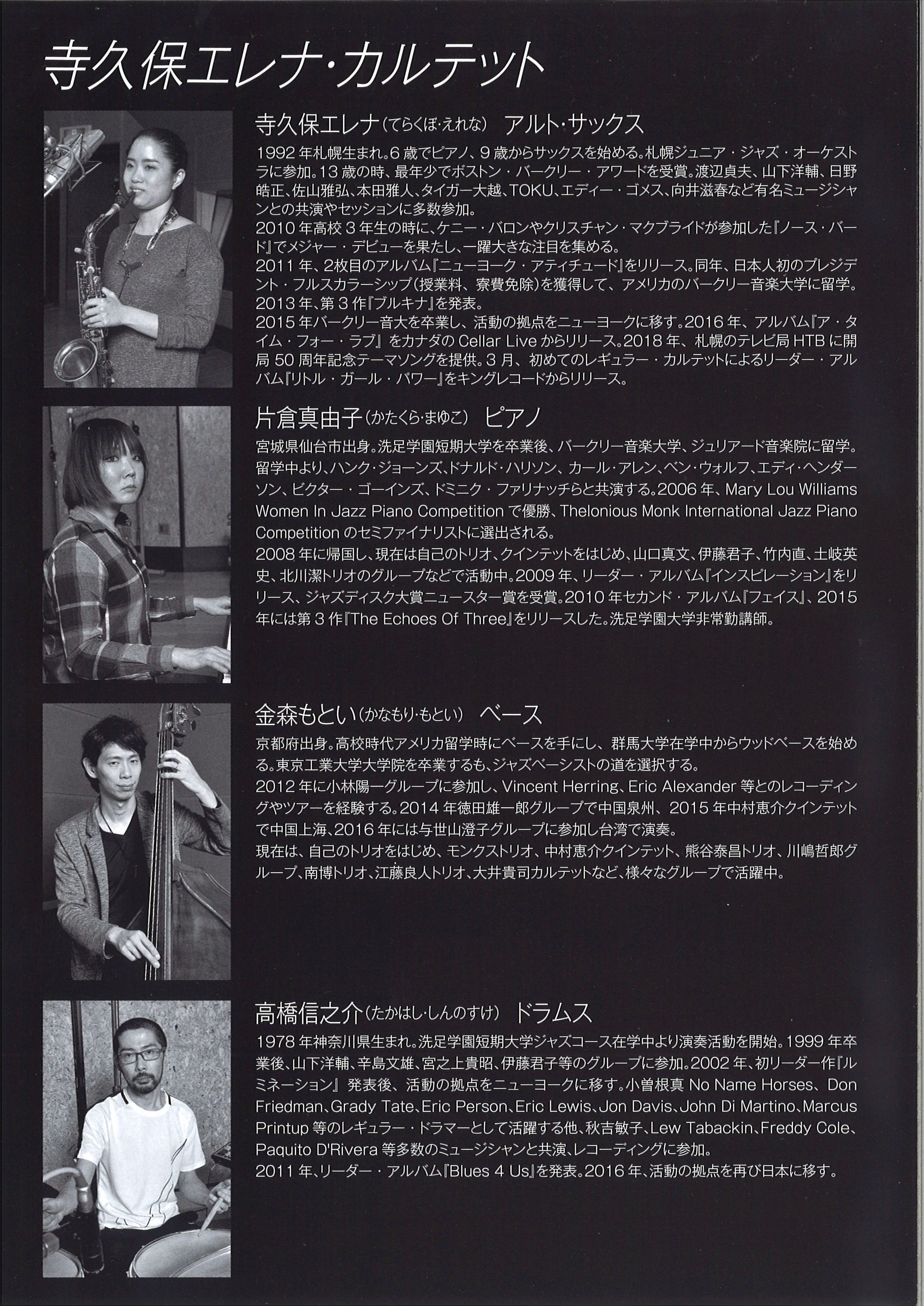 での「ジェイ・マスターズ with 渡辺貞夫」 のセッションを思い出しつつ、今日のライブを拝聴。辛島さんが体調が悪いながら見事なプレイを披露されていた。「ジェイ・マスターズ with 渡辺貞夫」 での1曲目と同じ「Five Spot After Dark」をエレナさん登場の1曲目に選ばれたのも辛島さんの想いをエレナさんの世代で引き継ぐ狙いがあったように想像する。