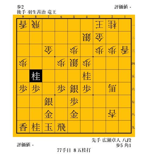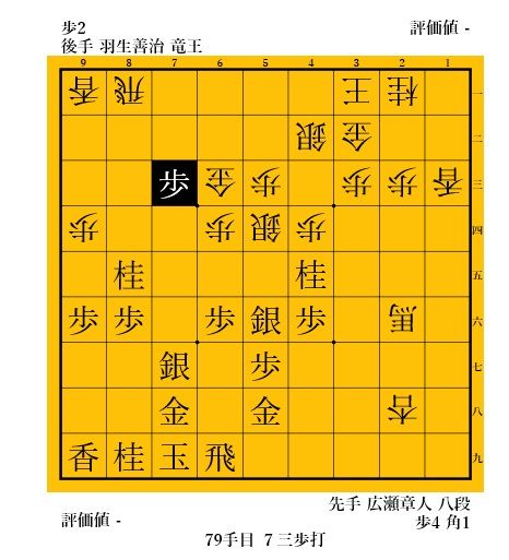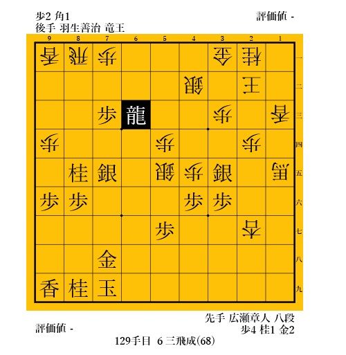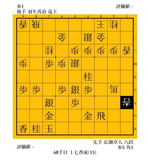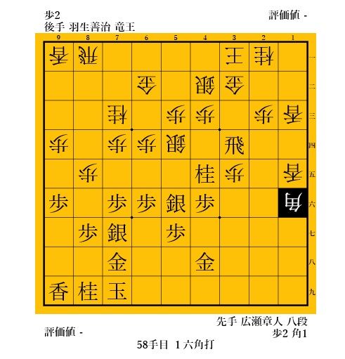 本局は実戦例▲佐藤天彦名人-△郷田真隆九段戦(2018年10月、王将戦挑戦者決定リーグ)と同様の進行で57手目▲3四飛まで来たが、郷田さんの58手目△4四歩ではなく、羽生さんは58手目△1六角打にこの歴史的な1局の命運を賭けた。佐藤‐郷田戦は先手佐藤さんの快勝だが、羽生さんは負けた郷田さん側を持って指す。馬と成香で広瀬さんの金と飛車を抑え込もうという大局観。
