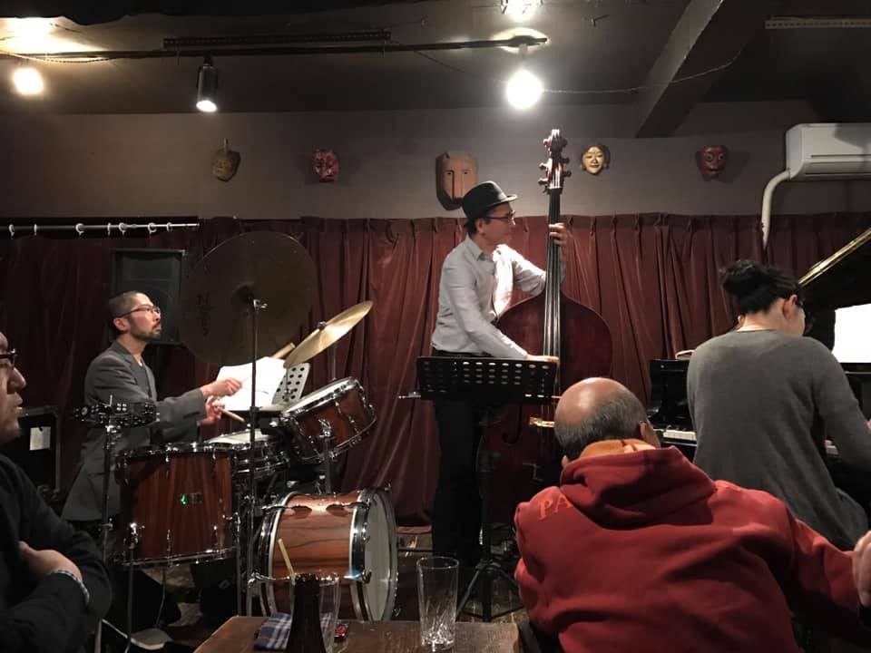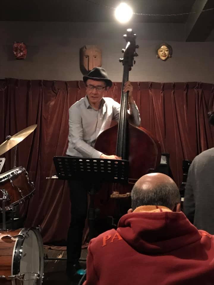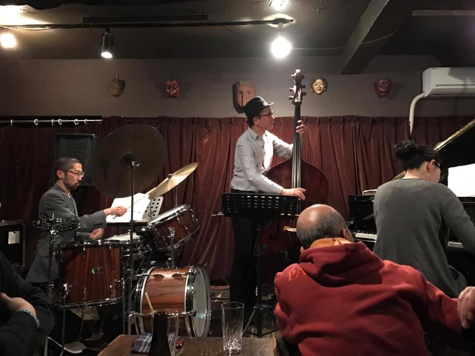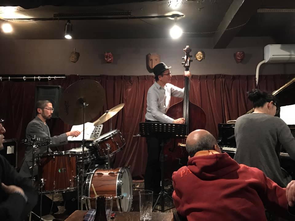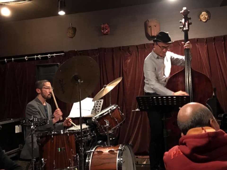 陽介さんは最近のライブは弓(アルコ)で弾くのが多かったそうで、久々の手で弾くベースの感覚が嬉しかったそうだ。順子さんの奏でるビート、信之介さんの躍動するドラミングを楽しみながら、一音一音大切に弾かれていた。