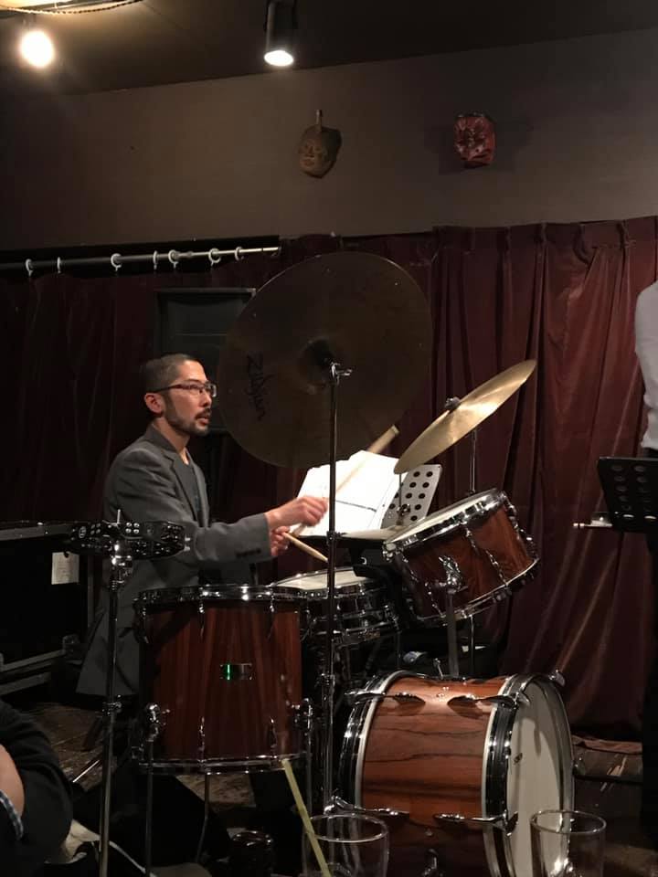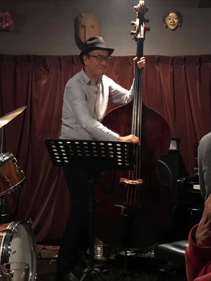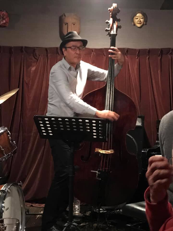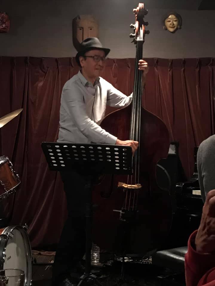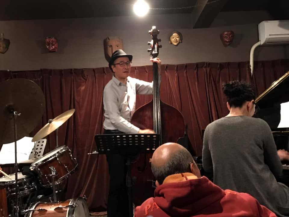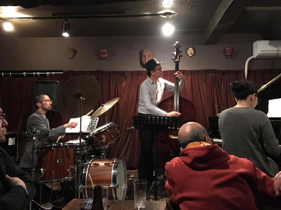 陽介さんは最近のライブは弓(アルコ)で弾くのが多かったそうで、久々の手で弾くベースの感覚が嬉しかったそうだ。順子さんの奏でるビート、信之介さんの躍動するドラミングを楽しみながら、一音一音大切に弾かれていた。