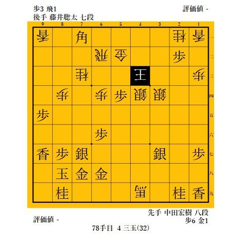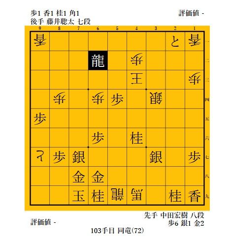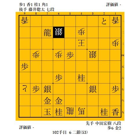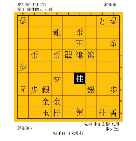 91手目▲7九玉とかわされるともう追えないかと思ったが、取り敢えず92手目 △5九飛打で王手。5四の歩を取って中田八段の攻めを緩和することも狙い。しかし、歩を取った龍を95手目 ▲4六桂打と追撃されると藤井君、困ったかと思ったが。。。