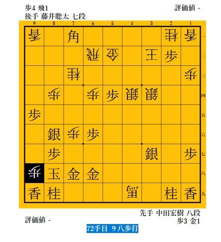 この玉形ではすぐには攻めては無理と判断して、70手目△3二玉と2筋から逃げ出す。追撃の71手目 ▲2二歩打。この歩には応接できないので、68手目△7六歩に連動した72手目 △9八歩打で先手陣の弱みの9筋を責める。佐藤六段、阿部七段「この手くらいしか無いが、藤井さん少し足りない」との解説。