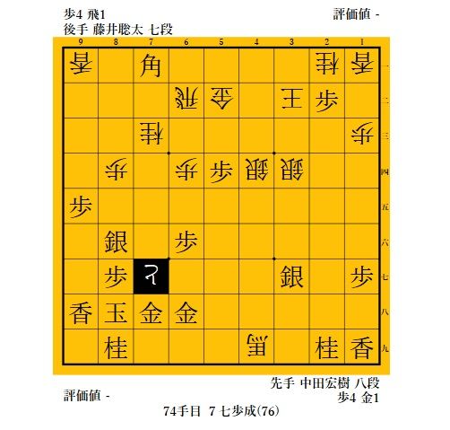 AbemaTVで中継を観出した局面は、藤井君の68手目△7六歩で歩を取り込む手に対して69手目▲8六銀。軽くいなした手。藤井君に「そんなに厳しい攻めはないでしょう」と言う中田八段の問いかけ。AbemaTVの解説のお二人佐藤六段、阿部七段も「今日は藤井さんの負け」という形勢判断だった。