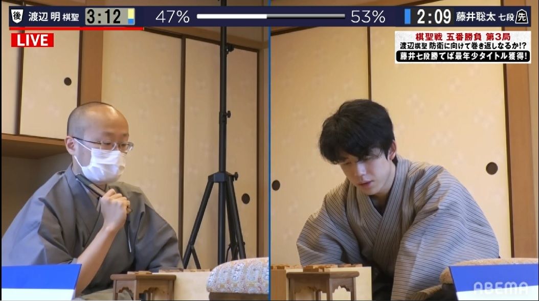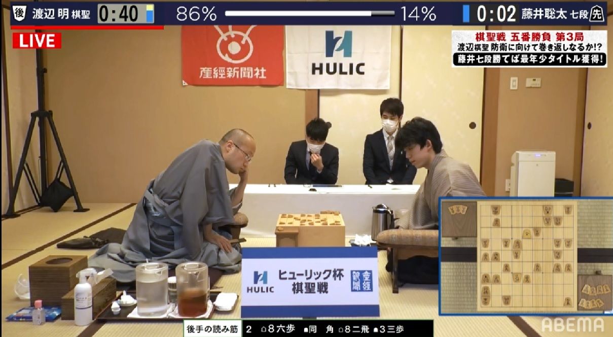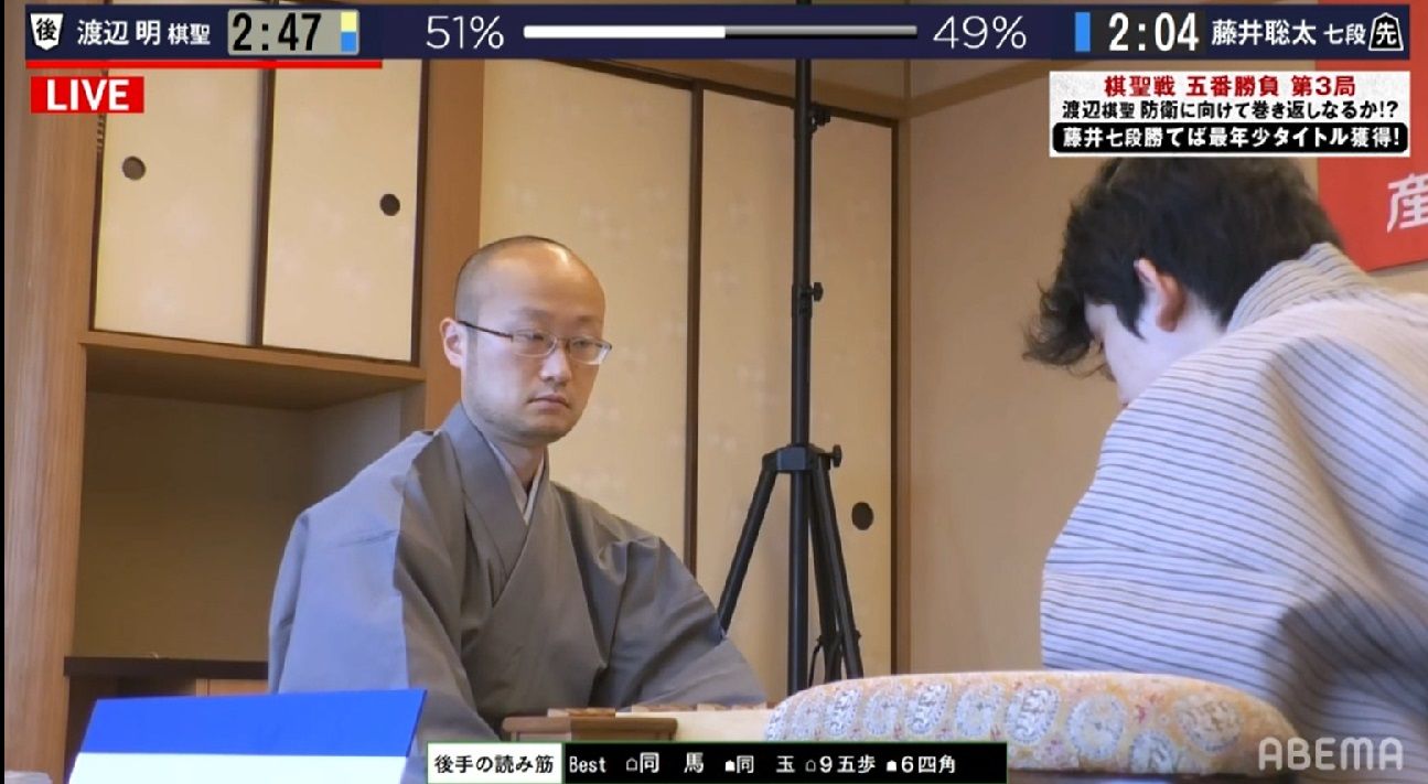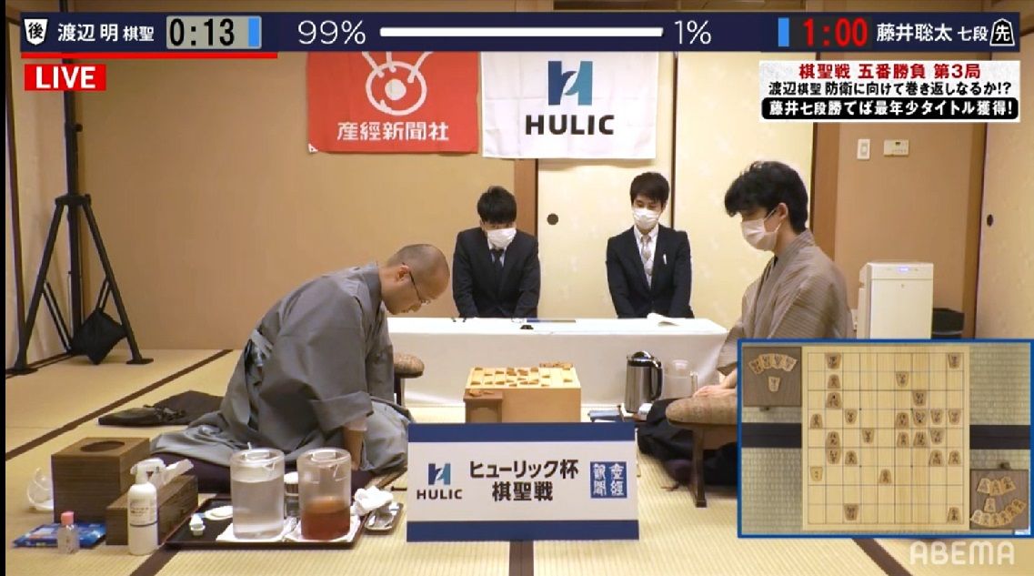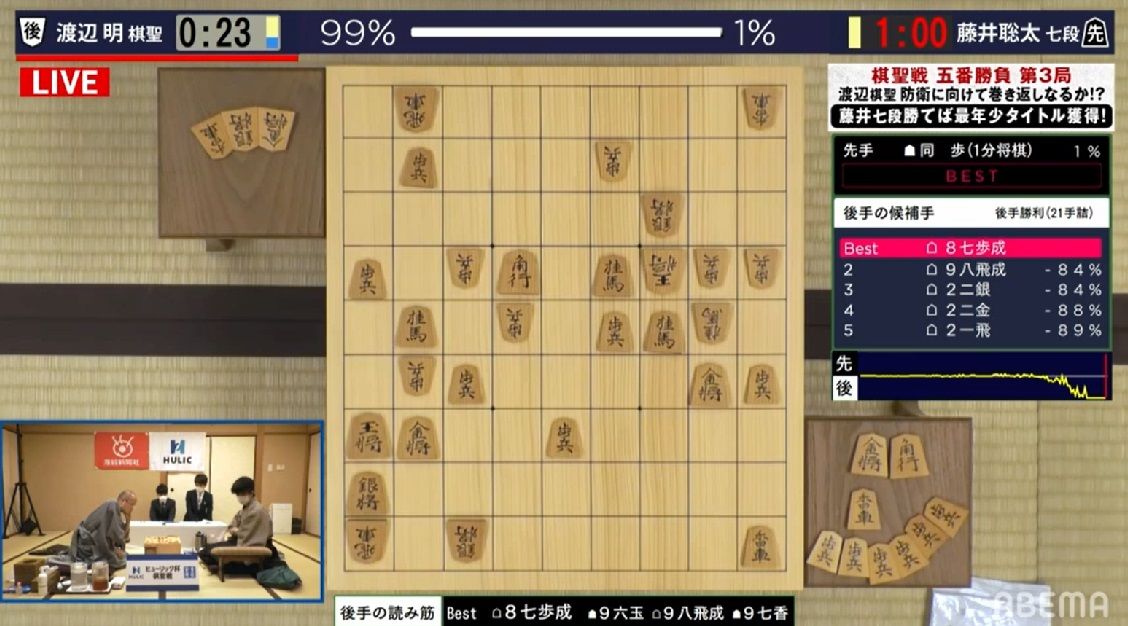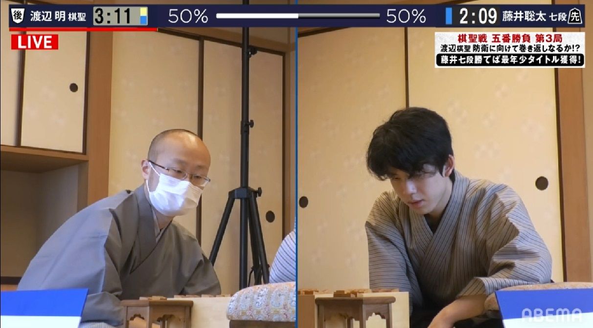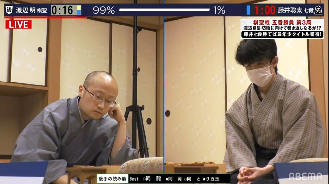 昼食休憩までに76手も進み、既に終盤に入ったと言われるほど、早い時間からの激戦になった。  先に仕掛けた藤井七段に対し、渡辺棋聖が反撃を開始。鋭い手の連発に対して、藤井七段も恐れずぎりぎりでかわす対応に出たが、最終盤に向けてリードを拡大した渡辺棋聖が、逆転を許さず慎重に勝ち切った。