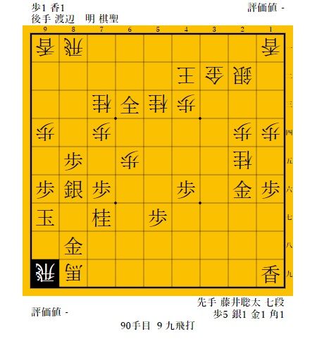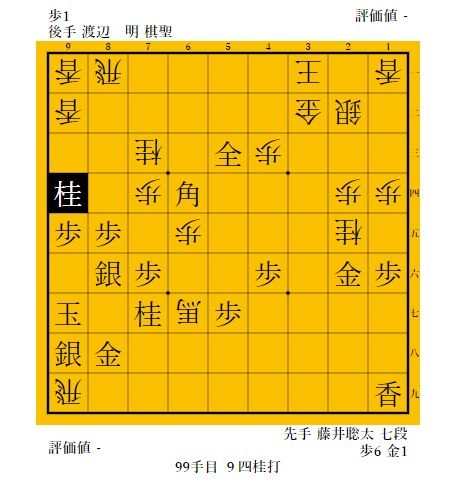 藤井君のラストチャンスは渡辺さんが王手を逃げての98手目 △3一玉の局面。実戦は99手目 ▲9四桂打としてしまったが、ここは専守防衛の▲7三馬が勝った。桂を取りつつ、9五歩を守る一手が必要だった。