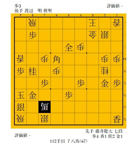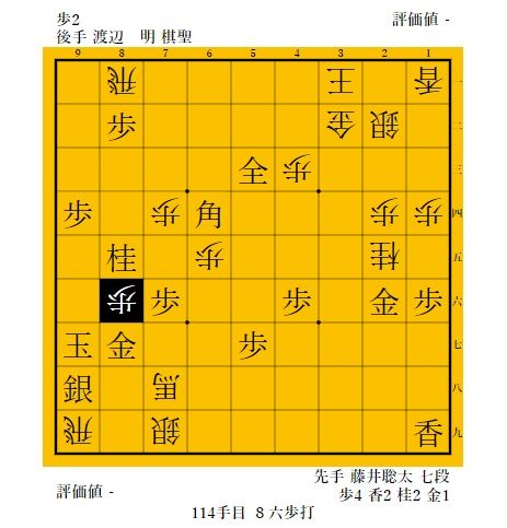 渡辺さんが勝ちになったという、112手目 △7八馬、続く114手目△8六歩打では藤井君、敗勢。