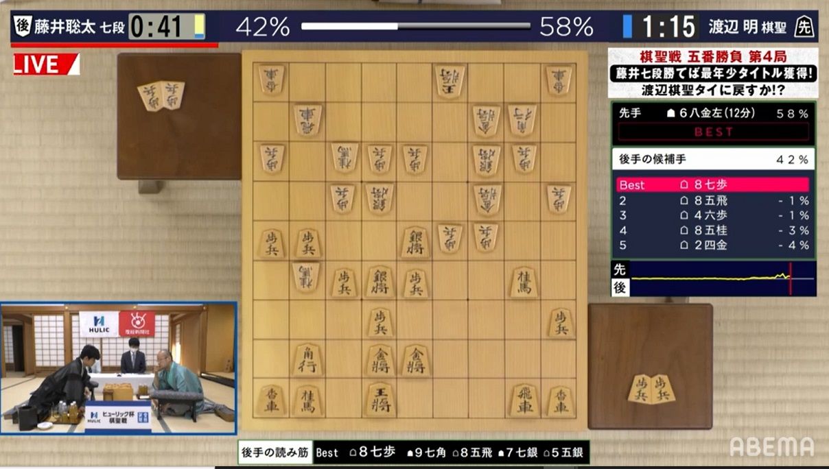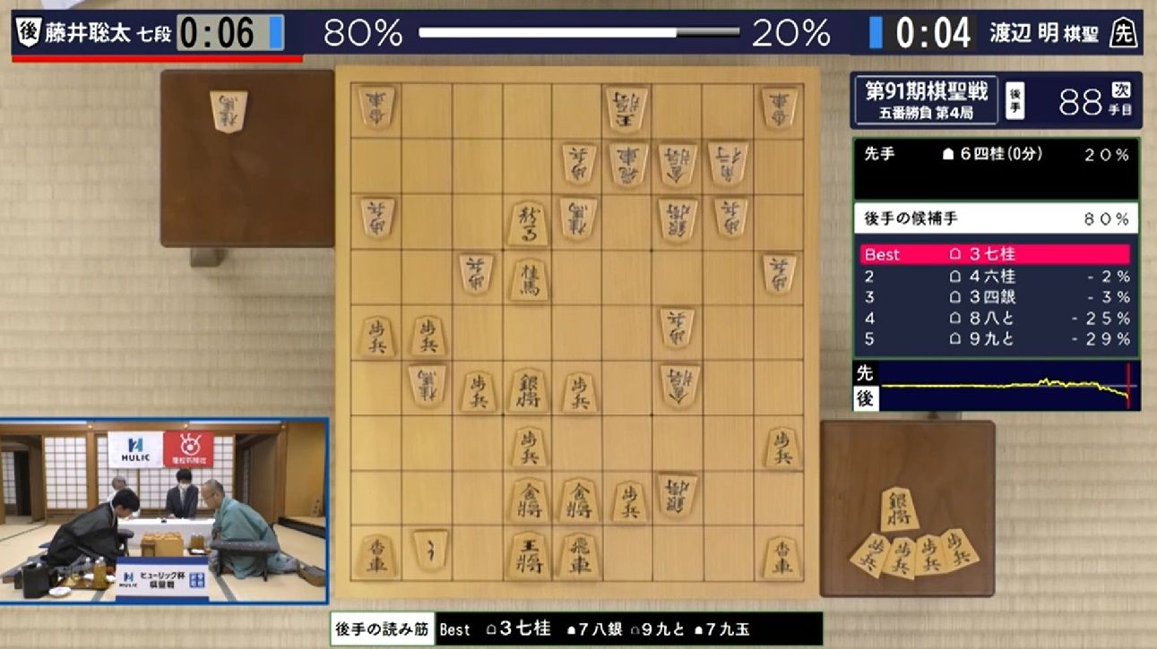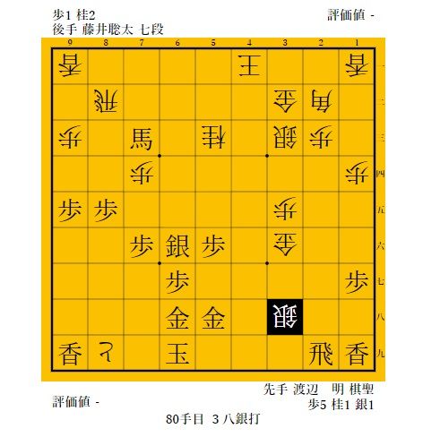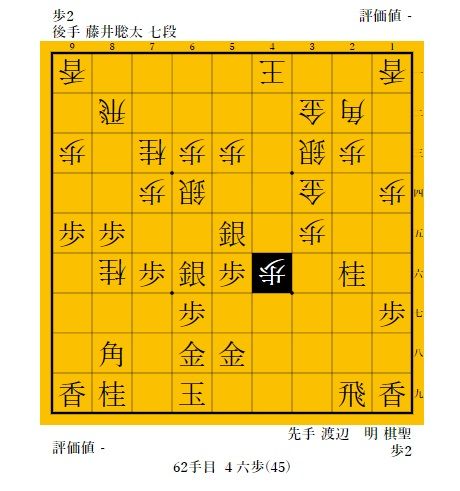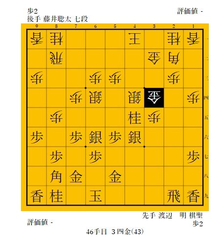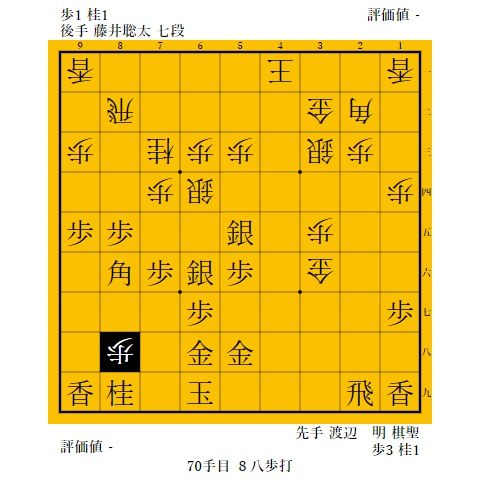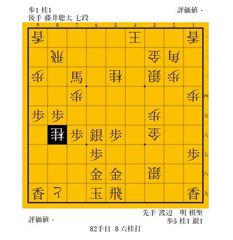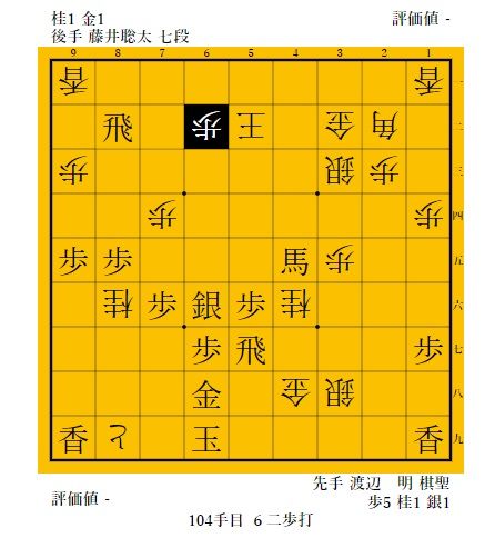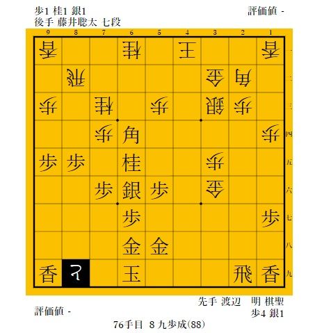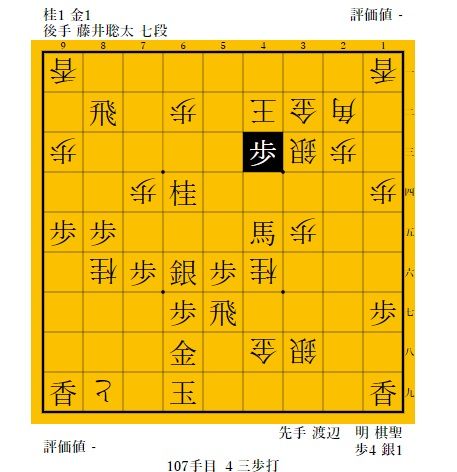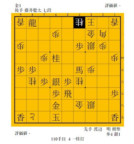 桂を打って▲7八玉の逃走を阻止。次に△4七桂が△5九桂成以下の詰めろ。最後まで藤井玉は頓死の筋がいくつもあったが、全ての渡辺さんの罠を見破って、110手目 △4一桂打で渡辺さん投了。