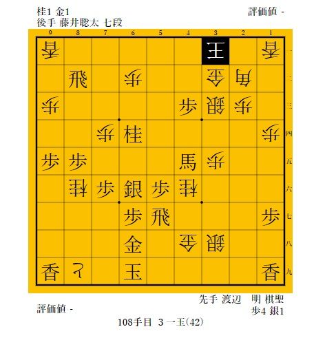 大逆転を狙う渡辺さんの罠2。105手目 ▲6四桂打に対して、△4一玉は▲6三馬でトン死。藤井君は罠を掻い潜って、△4二玉▲6二飛成△3一玉の進行。後手玉は詰みをギリギリ逃れている。