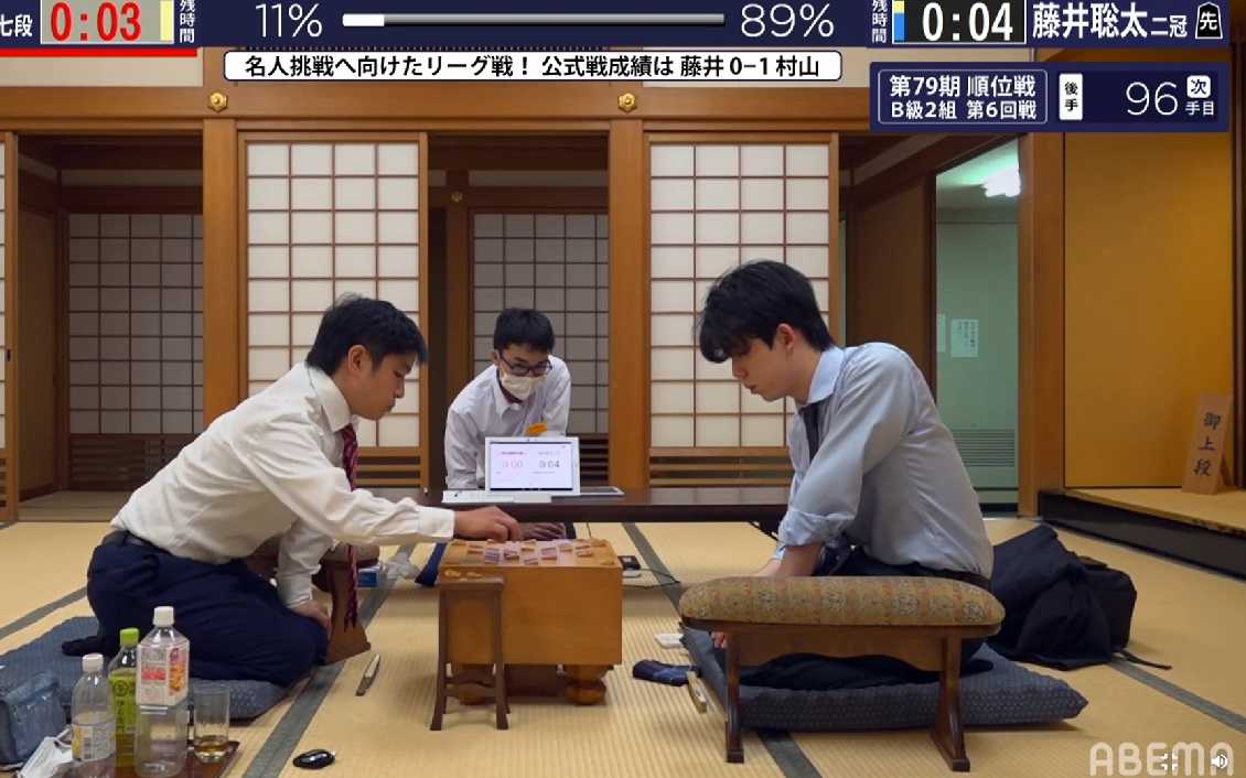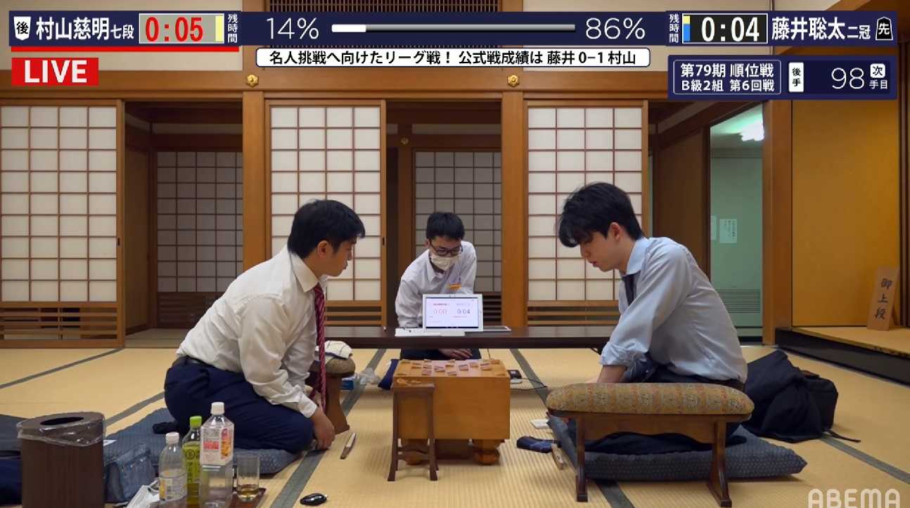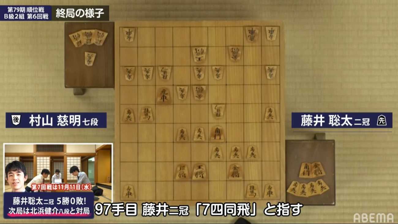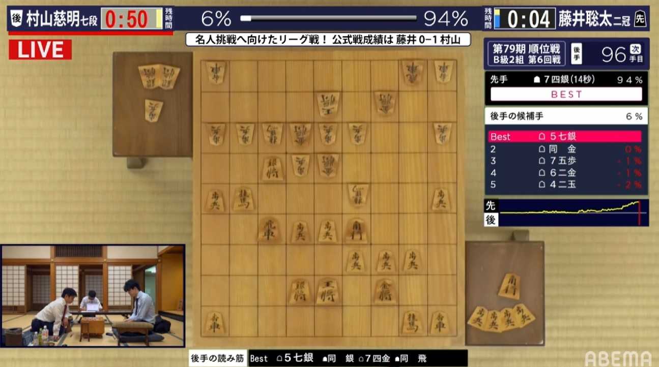 実戦では村山さんにここで良い手がなく、1時間17分の長考で54手目 △7五歩7筋の歩を伸ばしたが形勢は「藤井良し」になったようだ。