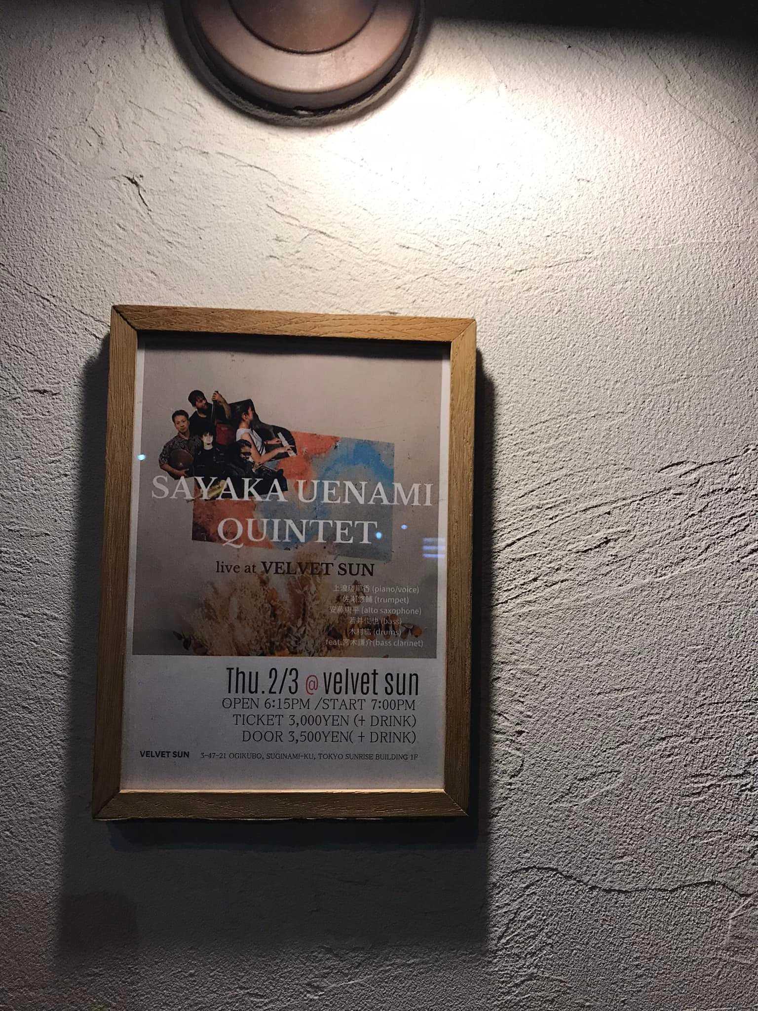 今日は荻窪ベルベットサンまで上浪瑳耶香さんの5tetを聴きに参上!