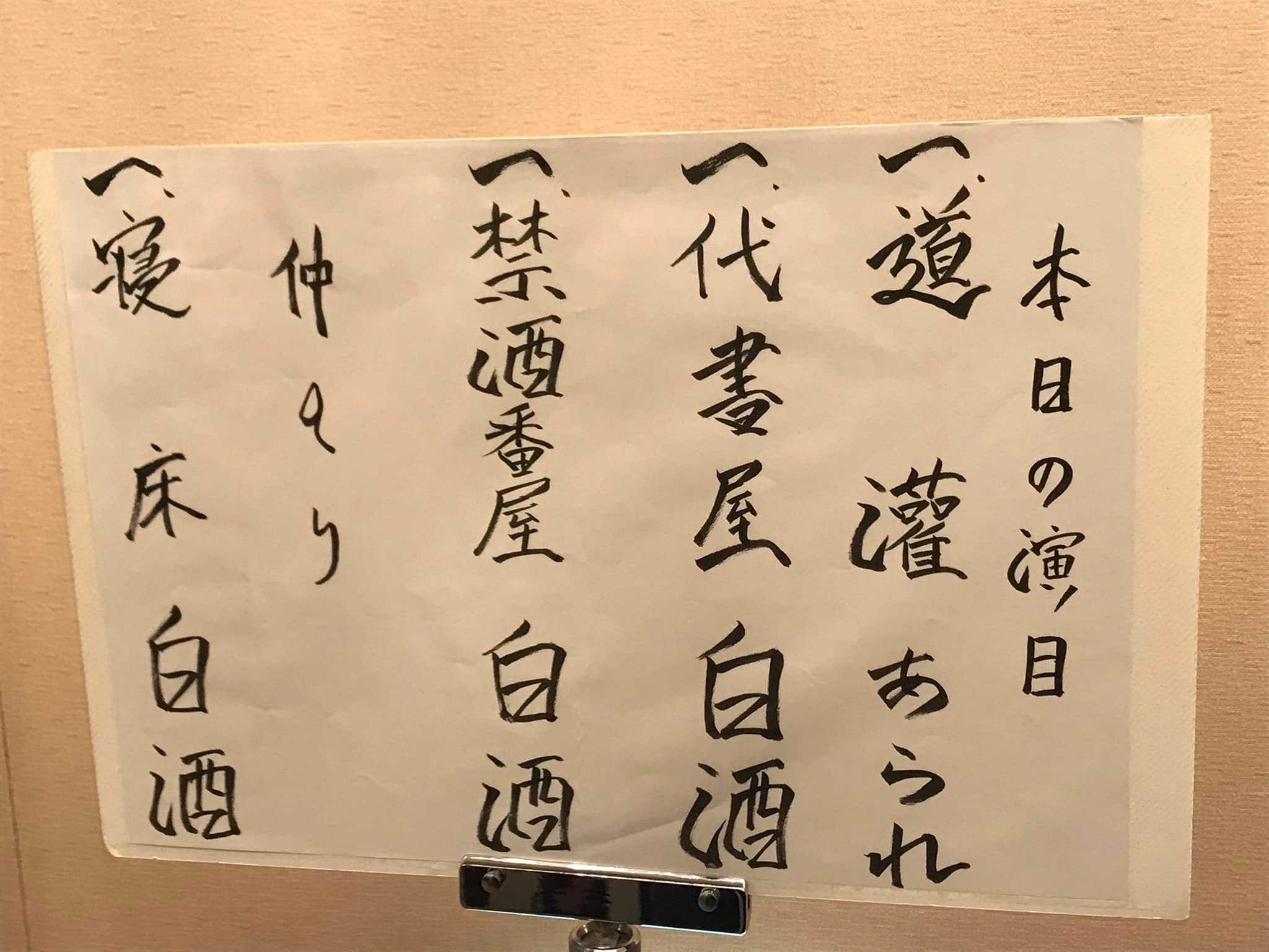 白酒さんの一席目は「代書屋」。白酒さんの「代書屋」はこの1年でおそらく4,5回目なので、「またか」と一瞬思うが、やはり抱腹絶倒。五代目 柳家小さん師匠、または、四代目 桂 三木助師匠の本名、小林盛夫が出て来るあたりが特に楽しい。