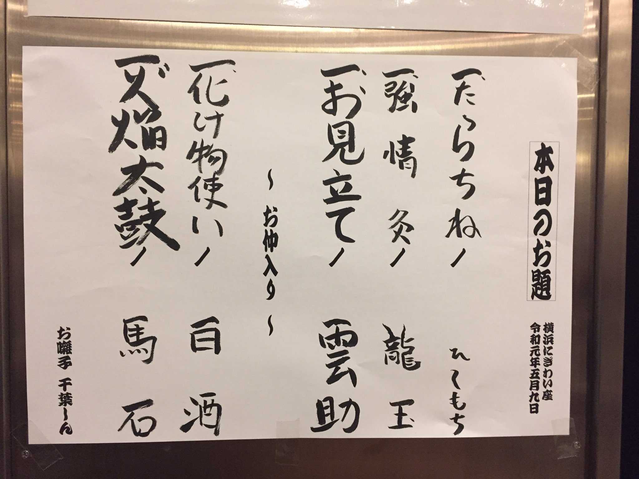 贔屓の白酒さんは「鰻の幇間」。白酒さんの「鰻の幇間」は初めてかも? 三三さん、一之輔さんの「鰻の幇間」もイイが、今日の白酒さんは随所に細かい工夫があって、「本寸法」。マクラで、雲助師匠が「美味しい肉団子弁当」に釣られて「トリ(大掃除役)」を引き受けた内幕を語る。事実は分からないが、何となく雲助一門のホンワカさが分かる。ちなみに、「肉団子弁当」と海鮮弁当を選べたようだが、白酒さん、馬石さん、龍玉さんは師匠に倣って、皆「肉団子弁当」を選んだ由。