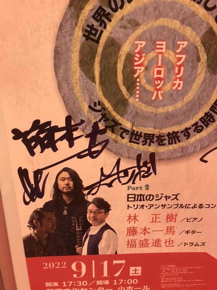 第二部:pf林正樹さん、gt藤本一馬さん、ds福盛進也さんのトリオ。Teal、flow、オネバ、yuragu、spectacular、Prayerの6曲。昨日9/16、一昨日のBob Jamesトリオとは全く違うが静謐なトリオの見事なInterplay。絶賛する松永誠剛さんの紹介で今日のライブが実現。