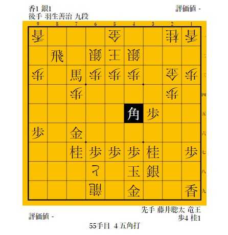 最後の決め手は藤井君の55手目 ▲4五角打。2三の金を召し上げる▲2三角成と▲6三角成の2つの狙いがあって、羽生さんの望みが潰えた。▲4五角打以外なら逆転もあったようだが、藤井君はキッチリ読み切りだった。