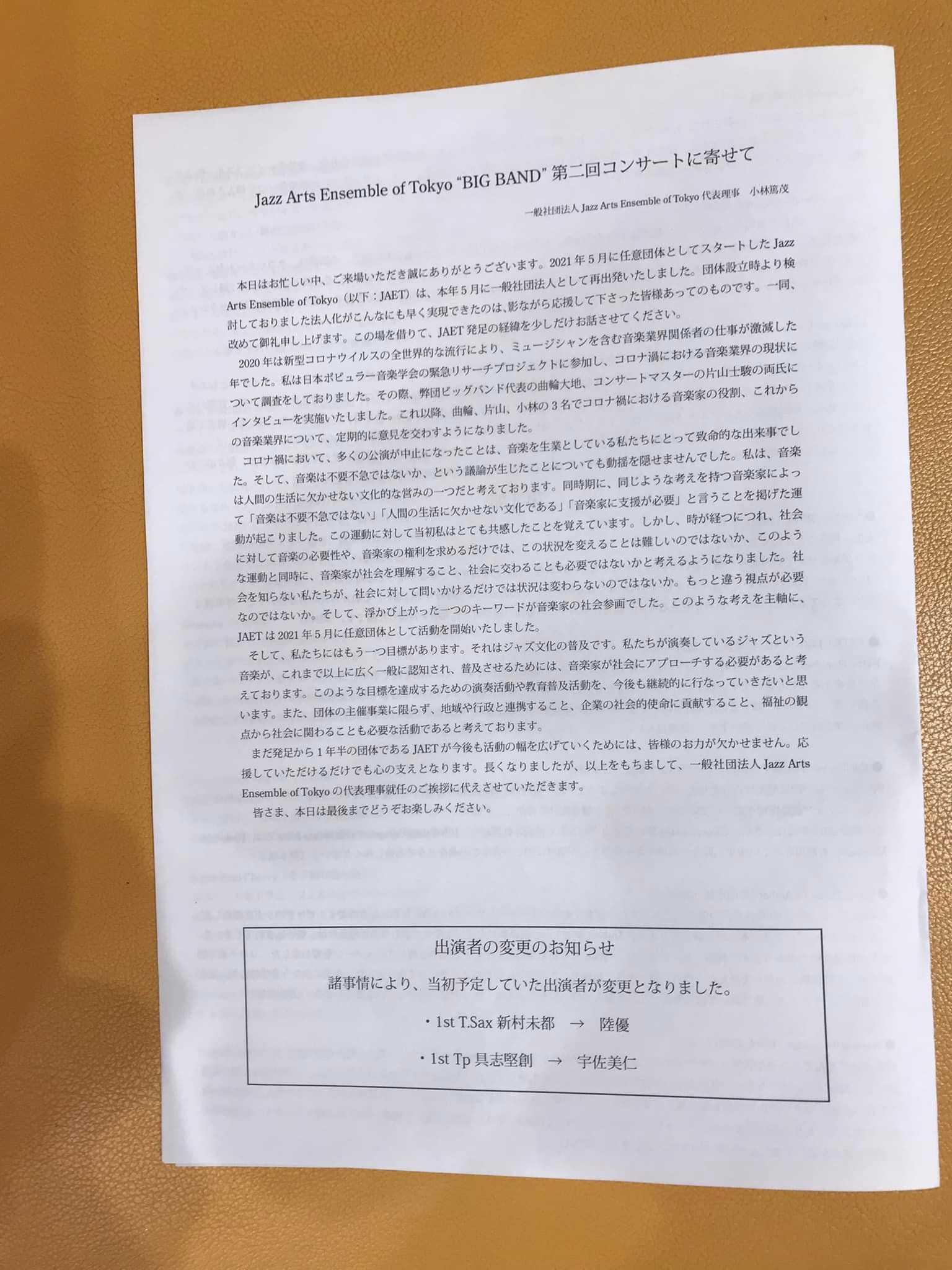 2022年9月30日(金)Jazz Arts Ensemble of Tokyo “BIG BAND” CONCERT Vol.2@サンパール荒川 大ホール