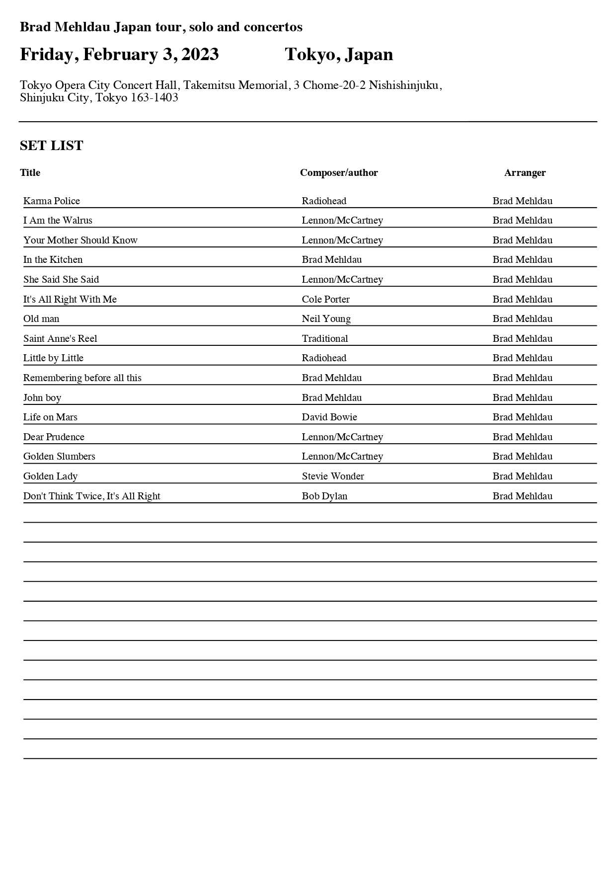 セットリストは『YOUR MOTHER SHOULD KNOW: BRAD MEHLDAU PLAYS THE BEATLES』と『Suite: April 2020』からの選曲が多め。他にはCole Porter、Neil Young、David Bowie、Stevie Wonder、 Bob DylanとJazz&Popsなど多岐に亘る選曲。どれも心に残る素晴らしい演奏だった。