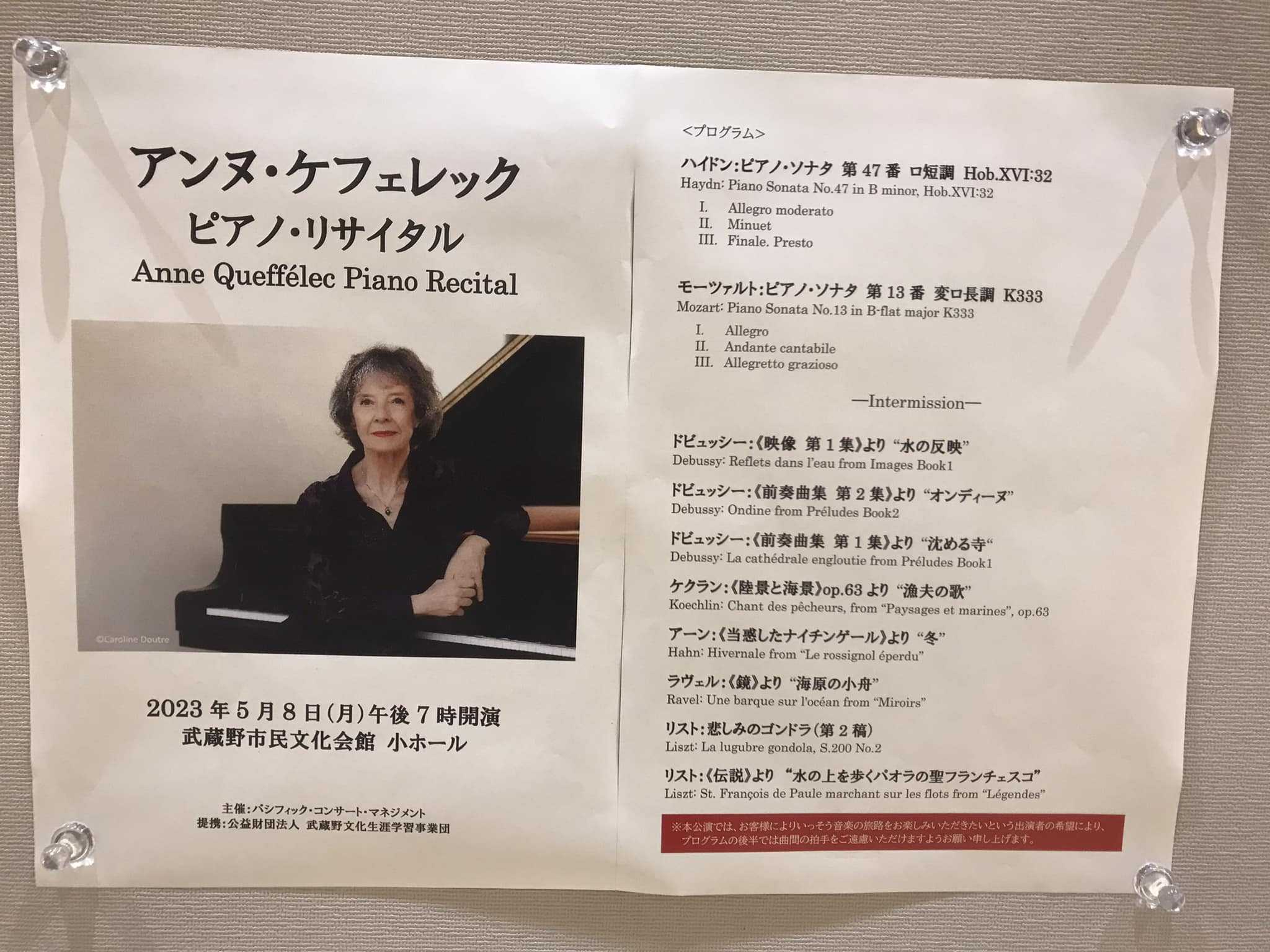 ​2023年5月8日(月) アンヌ・ケフェレック ピアノ・リサイタル@武蔵野市民文化会館 小ホール
