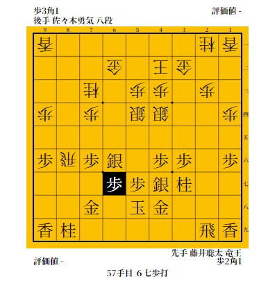 調べてみると、佐々木君のチャンスは少なかった。そのチャンスは前半の藤井君が15分の少考で「じっと」6筋を支えた、57手 ▲6七歩打 の局面。