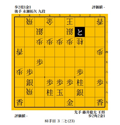 79手目 ▲8六歩打で飛車を8一に叱り付けてからの81手目▲3二とが最短の寄せ。83手目▲2三角打、85手目▲4一角打で永瀬玉を一気に責め立てた。