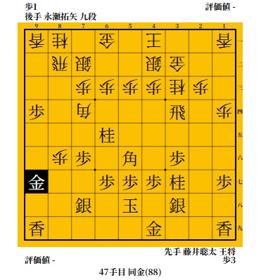 しかし、次の永瀬君の48手目 △9六歩打が緩手。ここは△9四香として、8筋、9筋の攻めを優先したかった。47手目▲9七同金を咎めたかった。