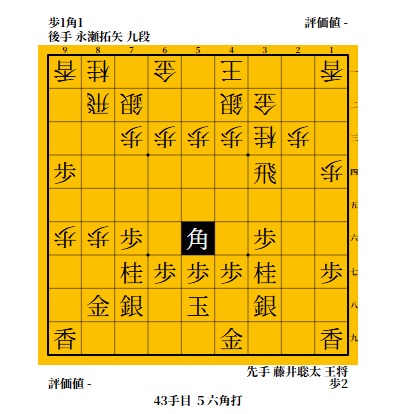 44手目 △7四角打としたが、ここは5四歩としたかった。以下、▲同5四飛、△5五歩打、▲同5五飛に△2八角打とすれば、香車の入手が確定し、△5一香打で飛車と角の田楽刺しで永瀬君が優勢。