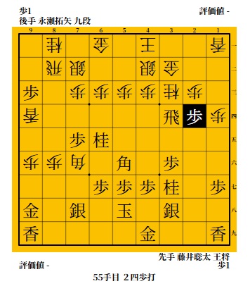 角の位置を7六までズラシテからの55手目 ▲2四歩打が凄くいい手。
