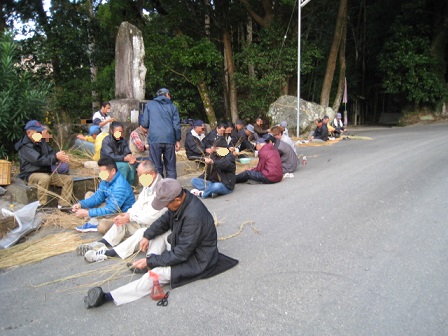 12月はなにかと忙しい中で町内の行事も多いものです先日は神社では七五三、しめかけ(しめ縄をはる)、火伏の神事がおこなわれましたしめかけ(しめ縄)を境内周辺に張るのですが朝7時頃から町民による縄ないが始まります 上組と下組の2組 写真は下組の方達、3人だけ上組の方が写っています 桶の水やスプレーは藁を湿らすために用います しめ縄やさん俵(お餅の皿)つくり、しめ縄の張りかたの先生は 私の父でも高齢と手の不自由から引退してしまいましたその息子は頼りないですがねみなさんから比較されるのが嫌なものです 出来上がった境内周辺に張るしめ縄ですこれとは別に、さん俵、もう少し太いしめ縄もつくります(社用)みなさんで御幣のしでを取り付けているところですまいていますから同じ位置につけると等間隔になるのですこの後、境内で神主さんによって神事がおこなれしめ縄も祓い清められますそして境内に張られるのです次回は境内周辺の張る しめかけ(しめ縄かけ)をご紹介します