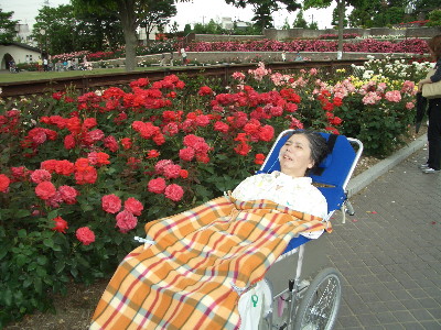 伊丹市の荒牧(あらまき)バラ公園へ行って来ました。娘(次女)が休みだったので同行してもらいました。今日はしっかり二人で車椅子移乗しました。公園は家から約3kmのところにあります。移動は車椅子タクシーです。1:30頃、現地に着きました。これが平日の公園かと思うほど人がいっぱいです。近くの介護施設から団体でみなさんお越しのようで、車椅子の人がたくさんいました。園内には250種1万本のバラがあって、今が春の開花時期です、一面のバラの花が見事でした。ずっと昔、子供達と一緒に来たことがあるのですが、妻に覚えているか聞くと目をパチンとしてくれました。バラの名前もそれぞれユニークで名前を見ているだけでも面白いです。写真のバラは「ビューティフルふくやま」という名前です。他に「LOVE」という名前のバラの前でも写真を撮ったのですが、そちらを載せると、(勝手にすれば)みたいな声が聞こえそうなので止めました。園内には青いバラもありました。青といっても薄い青ですが、テレビ以外で見たのは初めてでした。入場料は無料です。伊丹市には感謝です。3時に迎えに来てもらい、3時半頃自宅に着きました。4時過ぎからはリハビリです。今日は学生さんもお越しです。みんなでワイガヤ楽しいリハビリタイムでした。また来年も行けるようにがんばります。こちらに荒牧バラ公園・伊丹のバラ園のバラの花 壁紙写真があります。画像をクリックすると大きくなります。園内の様子が分かります。