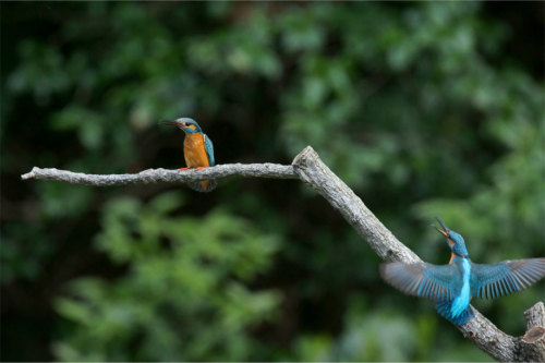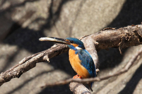 今日もカワセミ日和で、到着と同時に1羽のカワセミに会いました。でも、他に撮影している方が別の場所も気にしてました。そっちのほうにカワセミが飛んでいきました。あとを追ってみると・・・・2羽のカワセミです!どうやら縄張り争いをしているようです!お互いに見てないようで見てるようです。伸びをしたり体を前に突き出して威嚇しています。1羽が声をあげて威嚇してます!!大きく羽を広げて『くるなっ!』って言ってるみたいです。飛んだカワセミは結局同じ枝に戻ってきました。撮影角度を変えてみました。奥のカワセミにピントを合わせてみました。次は手前のカワセミにピントを合わせてみました。このあと1羽はどこかに行ってしまいました。次に本来撮りに行きたい撮影ポイントに移動しました。いました♪大きな魚をくわえてメスを呼んでました。でも、このときはメスは来なかったです><次に見かけたときは、さっきよりは小さな魚をくわえてました。一瞬だけ背景のいい場所に来てくれました♪急いで撮りました(^-^;このあと飛んで行ってのですが距離の遠いところにいました。とりあえずピントを合わせ・・・合ってるかも微妙でしたが・・・そしたらもう1羽がピントを合わせたカワセミのほうに行ったのを見かけたので撮りまくりました!肉眼ではほとんど見えないので・・・撮った写真をカメラで確認してみるとおっ!愛の営みが撮れてました♪もう1枚撮れてました^^でも、初見のシーンだけど・・・肉眼でまったく見れてないです。。。その後もオスがメスのために魚を捕ってました^^ポーズをとってくれました♪場所を移動をしましたが、近くで撮影出来る場所にとまってくれました^^今日も近くでたくさんの写真を撮らせてくれました♪