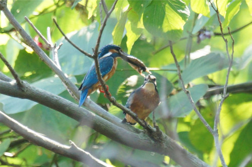 カワセミの三番子が巣から出てきたので撮影に行ってきました!親が捕ってきたエサを幼鳥にあげるところです♪エサは魚かな・・・。よく分からないです(^-^;大きいエサをもらいました!その後、時間をかけて飲み込んでました。さっきとは別の幼鳥です♪池から落ち葉を拾ってきて魚を叩きつける練習をしてました^^さらにもう1羽幼鳥がいました。どうやら全部で3羽の幼鳥がいるみたいです。メスの親カワセミがなにやら興奮してます・・・羽を大きく広げ、口を大きく開けてます・・・幼鳥にかぶりついた><この行為はなんの意味があるのかよく分かりません><今度はオスの親カワセミが魚を捕ってきました。あげるのかと思いきや幼鳥が魚をくわえてもあげませんでした。う~ん、幼鳥がいる位置が外敵から襲われやすいから他に行くように促しているのかな?(^-^;紅葉の木にとまったカワセミの幼鳥です♪紅葉が赤く染まるころにも撮らせてくれるといいなぁ^^奥に親カワセミが来ました!手前が幼鳥です。横に並んでくれないとボケます><