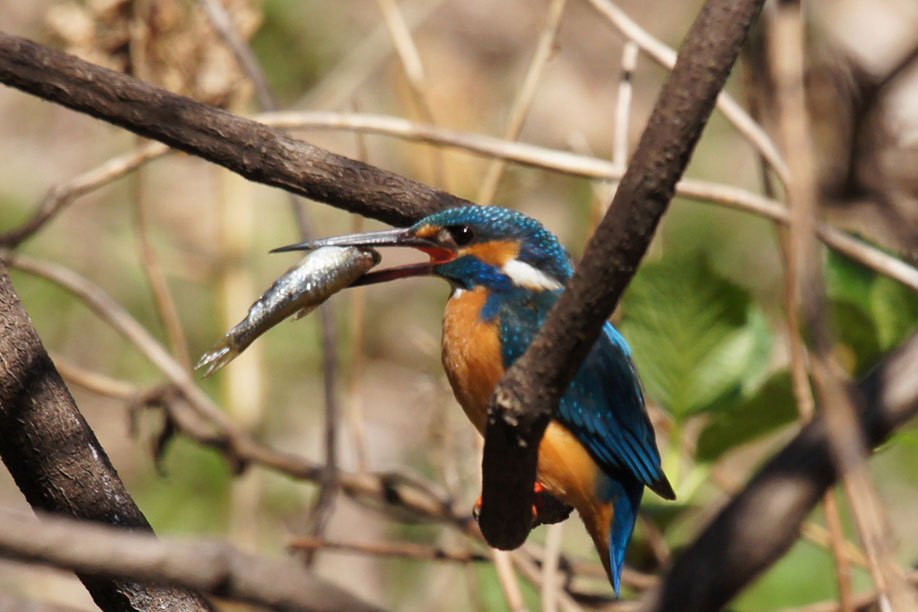オスのカワセミが魚をくわえてますが、魚の向きが反対です。