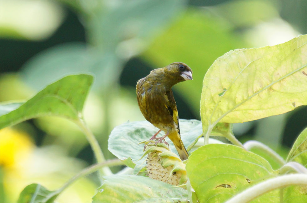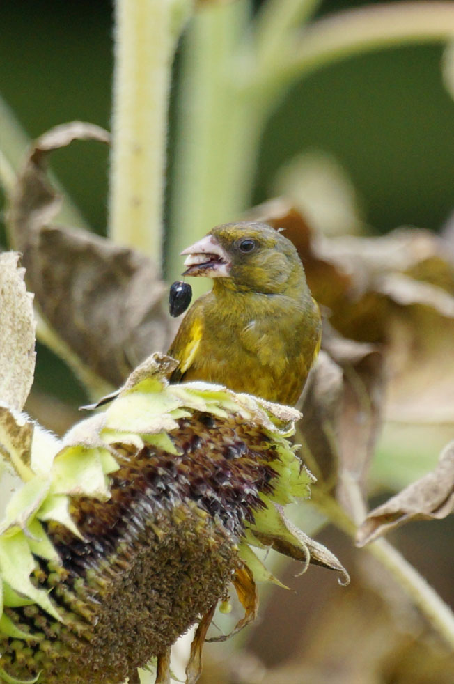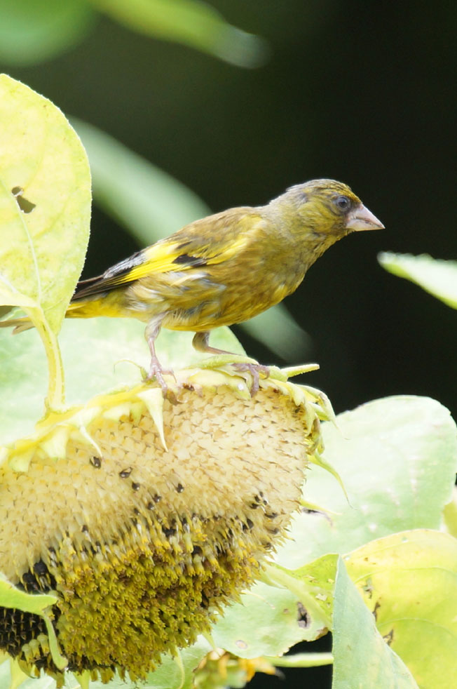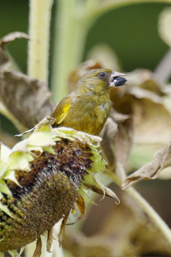 カワラヒワはヒマワリの種をとって中の柔らかいところを