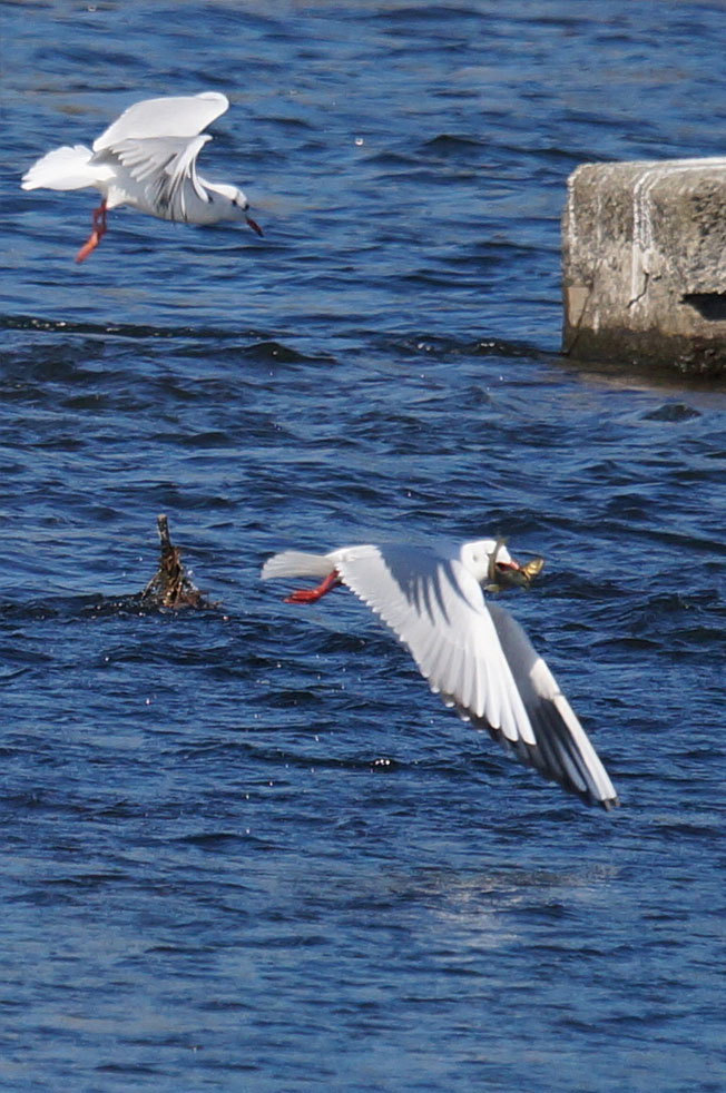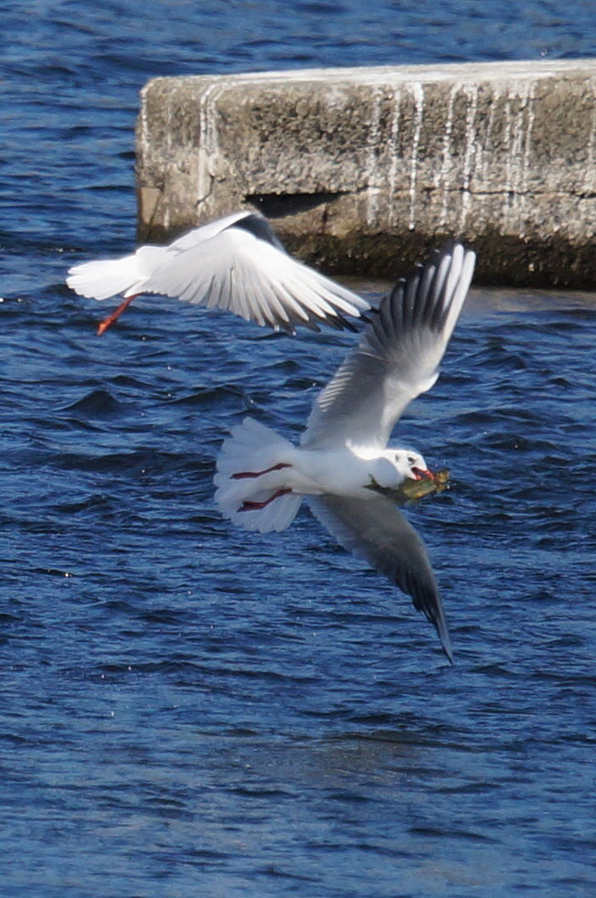魚をくわえて飛びさるユリカモメとそれを