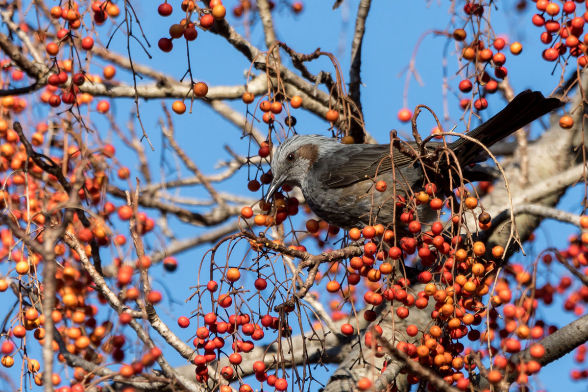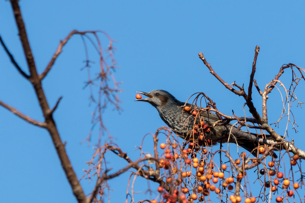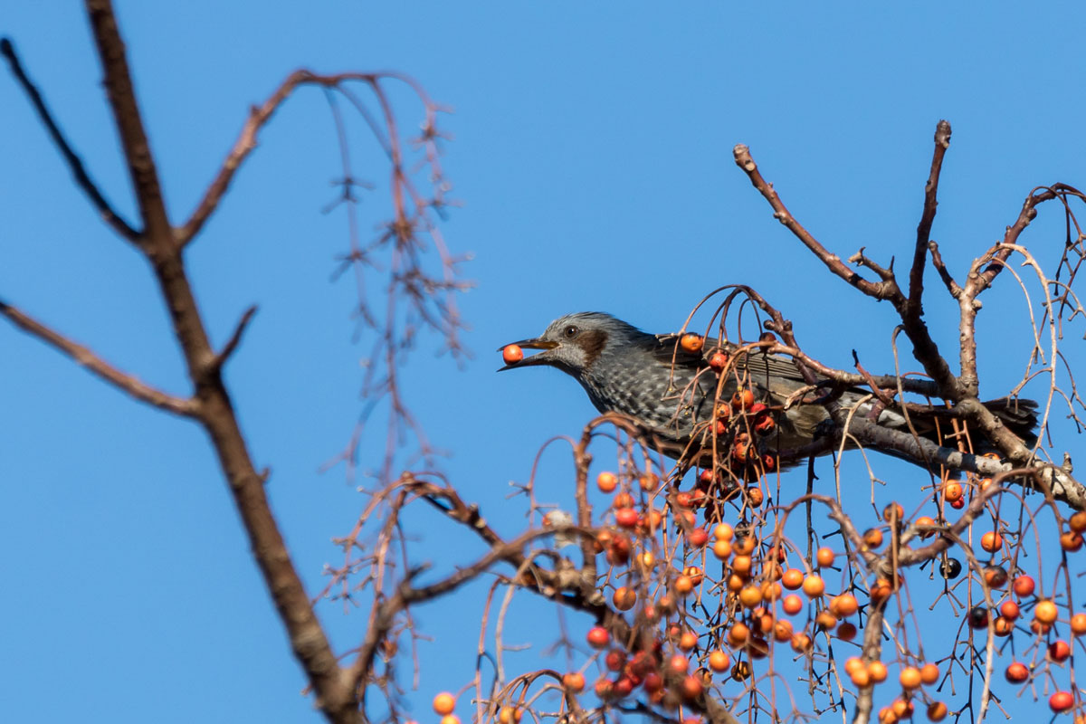 イイギリの実を食べに来たヒヨドリ。
