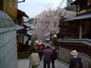 三年坂(産寧坂)変な名前だけど訳を聞いたら納得石段を上ったり下ったり、とても楽しい。有名なしだれ桜、電線がなければもっと綺麗なのに・・・