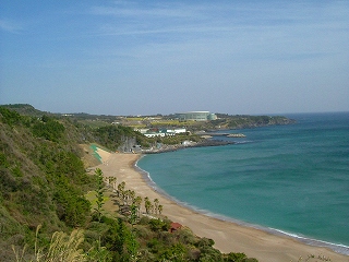 シュリの丘から望む中文 海水浴場、とても綺麗な海岸線、ベンチの後姿は失敗したけど・・・遠くコンベンションセンターが見えます。