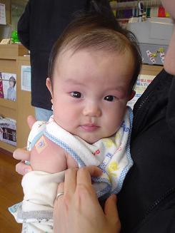 4ヶ月2週昨日、三種混合2回目をうちに病院に行ってきました。前回初めての注射でガン泣きしたりゅうだったので、きっと今回も大泣きだろうなあと思っていたのですが……今回はどうだったでしょう???先生が聴診器で診察してる時はニッコニコで超ご機嫌。↓ママに抱っこされたまま、腕を押さえられ、看護婦さんに注射される。↓ちくっ↓ちゅうううううう↓びええええええええええええええええええええええんんん!!!!!うえええええええええええええええええええんん!!!!うえええええええええええええええええええんん!!!!うえええええええええええええええええええんん!!!!↓きょとんあれ??もう泣きやんだ!!!…というわけで4回くらい大きな声で泣いた後はすぐ泣きやんで落ち着きました!!えらいぞりゅう!!さすが男の子だ!!!!今月末には4ヶ月児検診で、BCGもあるので、この調子でがんばろうとおもいまーーーーーす!!!!↓泣きやんだ時のりゅう。目がうるんでます(^_^;)がんばったご褒美?に今回ももんきちシールを貼ってもらいました♪
