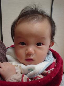 5ヶ月2日前回の日記にはうちの旦那さんへの応援のコメントありがとうございましたm(_ _)m旦那さんも色々だけど、趣味も色々なんだね。参考になりました!バイクだけが趣味の旦那さんだけど、少しでもストレス解消できるように考えてみます。まあひとまずは、せめて家にいるときはのんびり過ごせるように心を配っていこうと思います。さてさて、昨日は暖かかったけど、今日はまた寒かったですねー。雨が冷たかったです。厚着して毎日りゅうを買い物に連れ出していた私ですが、どうやらタイトルの通り「鼻風邪」をひいちゃったみたい…。 ↑鼻ちょうちんぶらさげてます!!かわいいので鼻水拭く前に一枚パチリ。熱もなく、食欲もあり、機嫌もいいので、まあじき治ると思うんだけど…おっぱい飲むときに鼻がつまってると飲みにくいみたいでちょっとイライラしてるみたい…笑大人でも鼻がつまるとなんかぼーっとしちゃうもんねえ。まだ自力で鼻かめないし、初めての鼻水にちょっと戸惑っているようです。早く治るといいな!しばらく外出は控えた方がいいかな…??週末はまた寒いみたいだし…。明日は旦那さんの両親がうちに遊びに来る予定です。風邪引かせちゃったの?って言われちゃうかなあ…(T_T)なんか冬の初めから「とにかく風邪引かせないようにね」って何度も何度も言われてたからちょっとプレッシャー感じちゃうな…別に私のせいではないのだと思うけど…。ま、大丈夫かな…あとりゅうは生まれたときから髪の毛が結構多い方だったんだけどもみあげのところが最近目に入るくらいのびてきたので(後ろははげだけどね…)今日思い切ってはさみで切ってみました!おおざっぱなこの私が切ったもんだから、しかも寝てる時に切れば良かったんだけど起きてるときに一瞬の隙をみてやったもんだから、ばっさりまっすぐ「いかにもはさみで切りました」みたいな、おかっぱ頭みたいになっちまったよ…(^_^;)苦笑てなわけで初めての散髪はもみあげはさみカットとなりました。次回はもう少し考えてから丁寧に切ってあげようと思います…笑