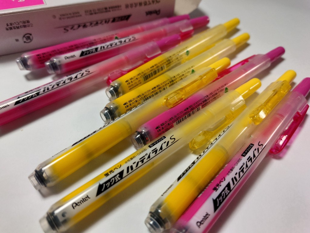 ぺんてるのノック式蛍光ペン「ハンディラインS」を今まで一体何本買ったかもはや数えきれない。おそらく100本ぐらいにはなると思う。50代半ばからの「学び直し」や資格取得の勉強で、この蛍光ペンがどれほど活躍したことか。I’ve lost count of how many Pentel retractable highlighters “Handy Line S” I’ve gone through over the years—probably around a hundred by now. Ever since I began “relearning” in my mid-fifties and studying for various qualifications, this highlighter has been an indispensable companion.この蛍光ペンのよいところは、ノック式で蓋がいらないことに加えて、リフィルを交換できることだ。実のところ、インク自体はすぐになくなってしまう(根を詰めて試験の勉強をしていたときなど、一日でなくなってしまうことも珍しくなかった)ので、私にとってリフィルは必携である。What I really like about this highlighter is not only that it’s retractable—so there’s no need for a cap—but also that the refill can be replaced. The thing is, the ink itself runs out pretty quickly (back when I was cramming for exams, it wasn’t unusual for the ink to be gone in a single day), so having refills on hand is absolutely essential for me.ただし。ここが重要なのだが、リフィルを交換できるからといって、本体が決していつまでも使えるものだと考えてはいけない。概ね2~3回ぐらい交換しているうちに、本体のノック機構が壊れてしまうことが多い(この仕組みが実に貧弱だったりする)。それと私の場合、うっかり芯(ペン先)を出しっぱなしにして放置し、芯が乾ききって使えなくなってしまうケースが極めて多い。That said—and this is important—just because the refill is replaceable doesn’t mean the body itself will last forever. In my experience, after two or three refills, the knock mechanism often breaks down (the build is rather flimsy, to be honest). On top of that, I have a bad habit of leaving the tip out by accident, only to come back and find the nib completely dried up and useless.#ペン先が乾いたときには、マニキュアの除光液を使うとよいといったTIPSがネット上で見つかるが、私はその手の方法で回復に成功した試しがない。# By the way, I’ve seen tips online suggesting you can revive a dried nib with nail polish remover, but I’ve never once succeeded with that trick.同様の商品が無印良品で売られている。OEMではないようで、ぺんてる製品と比べてみると、長さがかなり違う。ところが、ネット上で「ぺんてるのリフィルが無印のペンでも使える」というコメントを見つけて、使ったみたら確かに使えるのだ。地元に無印良品のショップがあることから、以来もっぱら無印のマーカーを使っていたのだが…。最近は、ぺんてるのハンディラインSを使うようにしている。というのも、どうも無印のマーカーの方がペン先が乾きやすいように思えて仕方ないのだ。それどころか、店舗の在庫管理の問題かもしれないが、購入した時点で半分乾いてしまっているようなものすらあった。上の写真でわかるように、長さがかなり異なることから、ペン先部分の作りが異なるのかもしれない。MUJI sells a similar product. It doesn’t seem to be an OEM version of Pentel’s, and when you compare them side by side, the length is quite different. Still, I came across a comment online saying that Pentel refills actually work with MUJI’s marker—and when I tried it, sure enough, it did. Since there’s a MUJI store nearby, I ended up using their markers almost exclusively for a while…Lately, though, I’ve gone back to Pentel’s Handy Line S. The reason is simple: MUJI’s version seems to dry out much faster. In fact, maybe due to stock management issues, I’ve even had the frustrating experience of buying one that already felt half-dried the moment I opened it. As you can see in the photo above, the two differ quite a bit in length, which might explain the differences in the nib construction.なお、アマゾンで交換用リフィルのレビューを読み返すと、「乾いていて使えない」というレビューが極めて多いが、これは交換インクが乾いているのではなくて、本体の芯が乾ききってしまっていることが原因だと思われる。Also, when I went back and checked the reviews for the refills on Amazon, I noticed a ton of people complaining that they were “already dry” and unusable. But I’m pretty sure the problem isn’t the refill ink itself—rather, it’s that the nib in the pen body has completely dried out.私自身の不可解な経験をもうひとつ。ピンクのリフィルをひと箱買って、長いこと使わずにいたら(数年単位)、なぜか一部のリフィルのインクがオレンジ色に変わってしまっていた。不思議なこともあるものだと思うと同時に、交換可能だからといって、あまり大量に備蓄しておかないほうがよいのかも、とも思った次第。Here’s another puzzling experience of mine. I once bought a box of pink refills and left them unused for years, only to discover that some of them had mysteriously turned orange. Strange, isn’t it? It made me realize that, just because the refills are replaceable, it might not be such a good idea to stock up on too many of them.
