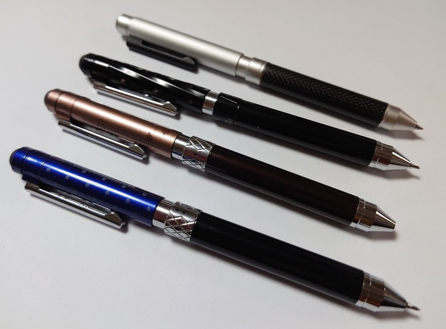 ゼブラの多機能ボールペン「シャーボX」がことのほか気に入っていて、折に触れて買い増していたら、いつのまにかこんな本数になっていた。I’ve grown especially fond of Zebra’s multi-function ballpoint pen, the “Sharbo X.” Every now and then I’d pick up another one, and before I knew it… I’d built up quite a collection.一番奥のカーボンファイバーのものは、「地デジ放送開始」の記念品としてもらったもの。あの頃は、地デジの開始だけでなく、アナログ放送の終了、東京タワーからスカイツリーへの送信所移転など、いろいろ苦労もあったが、今となってはそれらを語る人もいない。しかし、この1本が私のシャーボ好きのきっかけになったのだからわからないものだ。手前の2本は、限定品のスヌーピーコラボ柄。私はフツーに使っているが、実は結構レアものなのかもしれない。そういうえば、スターウォーズとのコラボ柄なども売られていたっけ。The carbon fiber one in the back was actually a commemorative gift for the launch of digital terrestrial broadcasting in Japan. Back then, it wasn’t just about the start of digital TV—it also meant the end of analog broadcasting and the move of the transmission site from Tokyo Tower to the Skytree. It was a time of challenges, but now hardly anyone talks about it anymore. Still, that one pen is what sparked my love for the Sharbo, so you never know where things will lead.The two in front are limited-edition Snoopy collaborations. I use them as if they were ordinary pens, but in reality, they might be pretty rare items. Come to think of it, I remember there being Star Wars collaboration models on sale too.この辺がもっぱら仕事や日常用にガシガシ使っているものだ。クリップの部分にガタが来ているものもあるが、総じて10年以上使っているわりによく保っていると思う。ちなみに、これらの品は概ね1本4〜5K。万年筆よりも実用的なので、贈答用にも重宝している。これまで何本ギフト用に送ったか覚えていないぐらいである。These are the ones I mostly use for work and everyday purposes. Some of the clips are a bit loose by now, but all in all, considering I’ve been using them for over ten years, they’ve held up remarkably well.By the way, each of these pens generally costs around 4–5K yen. They’re more practical than fountain pens, which makes them great for gifts as well. I’ve lost count of how many I’ve given as presents over the years.さて、そんなシャーボだが、最近はハンズやデパートに行っても、あまり現物が置いてなくて、代わりにこの「シャーボnu」という廉価版をよく目にする。値段が1.5K前後と安く、従来分解しなければ補充できなかったシャープ芯を上から入れられるというのがウリだが、実際に使ってみると、文字を書いているときや筐体を回した時の剛性感が従来のシャーボXに比してイマイチで、正直ピンとこない。というわけで、次に購入するならまたシャーボXかなと思っている。まあこれだけ本数が揃っているので、当面必要がないといえばないのだが。These days, though, even when I go to Hands or department stores, the original Sharbo isn’t often on display. Instead, I frequently come across this cheaper version called the “Sharbo nu.” Priced around 1.5K yen, its selling points are that you can refill the mechanical pencil lead from the top—no need to disassemble the pen as with the original.However, in practice, the feel isn’t quite the same. Whether writing or twisting the body, the rigidity and overall sensation fall short compared to the classic Sharbo X, and honestly, it doesn’t quite click for me. So, if I were to buy another one, I’d probably go back to the Sharbo X. Well, with the collection I already have, there’s no immediate need anyway.