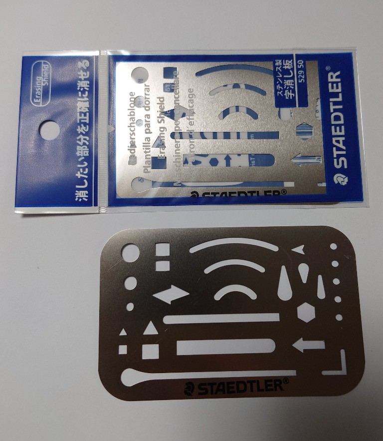 懐かしい人にとっては、とても懐かしい品。会社に入社当初はみなこれを使っていたものだが、PCが普及するとともに、ほとんどみかけなくなってしまった。私はといえば、今でもこれをデスクに常備していて、メモ帳の細かい文字を修正したいときなどに大変重宝している。スケジュールはほぼスマホとPCのアウトルックで管理しているが、ノートと鉛筆は未だに手放せないのだ。ちなみにこの字消し板、金属同士が擦れると嫌な感触があるので、私は端にテープを貼って使っている。先日買い増した際に子供たちにも見せたが、案の定見たことも聞いたこともないとのことだった。寂しいなぁ。For those who remember it, this little tool brings back a wave of nostalgia. Back when I first joined the company, everyone used one, but once PCs became widespread, it all but disappeared from sight.As for me, I still keep one on my desk to this day, and it’s incredibly handy when I need to erase tiny characters on a notepad. While I manage my schedule almost entirely on my smartphone and Outlook on my PC, I still can’t part with a notebook and pencil. By the way, since I dislike the unpleasant feel of metal scraping against metal, I put a strip of tape along the edge when I use it.The other day I bought a new one and showed it to my kids—unsurprisingly, they had never seen or even heard of such a thing. That made me feel just a little wistful.