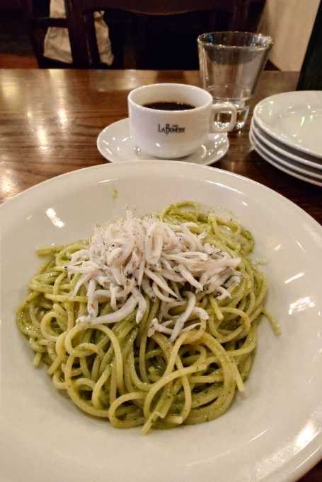 三宿通沿いにある「ラ・ボエム」で注文したしらすのジェノベーゼ。ランチタイムが終了していたので、単品でこのパスタとコーヒーを頼んだら2000円近くかかってしまった。 At La Bohème on Shukudōri, I ordered the shirasu Genovese. Since lunch hours had already ended, ordering just the pasta and a coffee à la carte ended up costing nearly 2,000 yen.