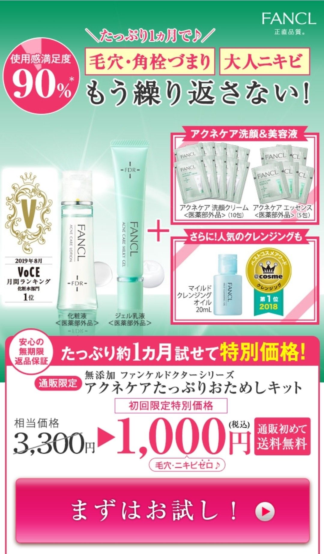こんばんは😃🌃みなさんニキビってできます??生理前になるといっつも顎辺りにニキビが出来るのが悩みです。。。気を付けててもホルモンバランスの乱れに勝てない😰💨せっかくなので(?)新しい化粧品試してみたいなーと思い、たまたまみつけたFANCLさんの【大人ニキビ用アクネケア1ヶ月お試し1000円!!】のセットを頼んでみたのです👏→FANCLさんの公式サイトはコチラ化粧品はとにかく試してみないとね!かならず相性があるから気になるものは高くても安くても試したくなります✨1000円って嬉しいし、大きいの買う前に試せるのって失敗がなくて安心😃💕劇的な効果が得られないとリピ買いはしないと思いますが!セット内容化粧水とジェル乳液が1ヶ月分アクネケア 洗顔料10回分アクネケア エッセンス(部分美容液)定番マイクロクレンジングオイル10回分本日届いたので早速試してみましたよ😉今日はメイクしてなかったのでメイク落としは使いませんでした!洗顔緩めのテクスチャーでした。匂いも特になし。泡立てネットで泡立てるとかなりキメ細やかなモコモコ泡になりました!すごく好きな感じ!顔に乗せると全然へたれずです。硬めの生クリームみたいな、しっかりとした泡でした。使用感ニキビケア用なのでつっぱったりするのかなと思ってましたが、洗いあがりはすっきりだけどしっとりしてます。しっとりというかサラリとしてるって表現の方が近いかな。想像していたより全然良かったです!洗顔は10回分しかついてないのが残念。10回使ってみて、効果も感じられたら通常サイズの購入も検討してみたいな。ファンケル (fanclL) アクネケア 洗顔クリーム 1本次に化粧水お試しなのにかなりしっかりしたパッケージ!旅行用とかに欲しいくらいです。ほぼ水!とろみ0のさらっさら化粧水です。さすがニキビケア。使用感でもつけてみるとこれもまたしっかり保湿された感があります。もちもち。べたつきはなし。良い。次はアクネケアエッセンス(部分美容液)こちらはニキビを速攻集中ケアする部分美容液らしいです。出来てしまったニキビや、これから出来そうだなぁってところに塗るんですって今回は毎回出来る顎にヌリヌリ。塗ったところだけ膜が出来たかのようにテカテカしてました。それだけ!1日目なのでそれ以上コメントできずですね。守られてるって感じがして嫌いじゃないです!最後に乳液ジェルこちらも化粧水同様1ヶ月分なのでたっぷりでした✨これだけで1000円の価値ありそうです。テクスチャーはハンドクリームみたいな感じでよくある乳液より硬めでした。つけた感じはベタつかず、保湿不足も感じず。【1日目のレポ】結果はまだわからないですが、使用感としてはとても好印象!化粧水も乳液ジェルも開封と同時に商品の密封されたところに穴をあけるって形なのがすごく衛生的だし、フレッシュでいいなぁと思いました。さすがFANCL👏そしてニキビケアなのにさっぱりしすぎないところがアラサー的にはとても嬉しかった!大人ニキビはさっぱりなだけじゃダメなんですよね。わかっていらっしゃる。今触ってもしっとりもちもちしてて気持ちよいい❗これは期待できそうです。経過は引き続きblogに残していこうと思います💪❇気になる方はFANCLさんの公式サイトいくとお試し買えますよ😁お試しはないけど通常サイズなら楽天でも購入可能です!FANCL●ファンケル● アクネケア ジェル乳液<医薬部外品> ●1本 ファンケル化粧品 乳液 ニキビケアFANCL●ファンケル● アクネケア 化粧液● 1本ファンケル FANCL アクネケア エッセンス 8g最後まで読んでいただきありがとうございました♡