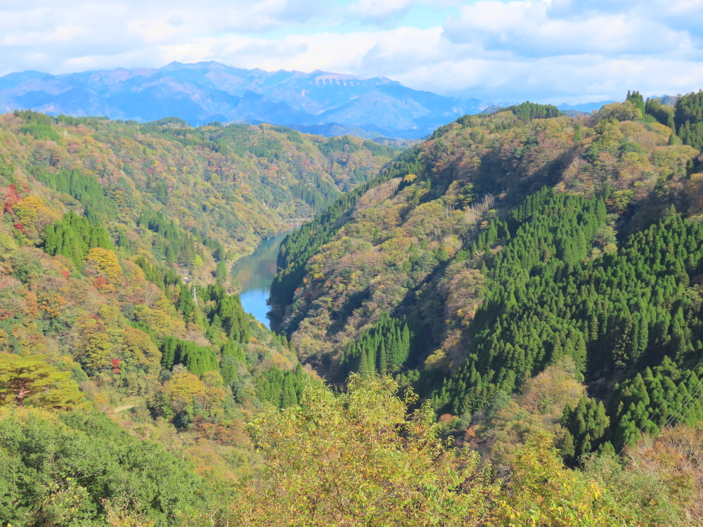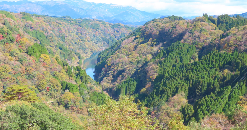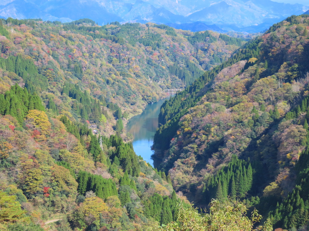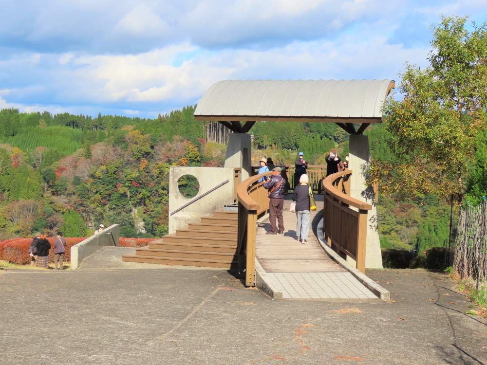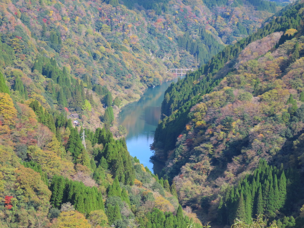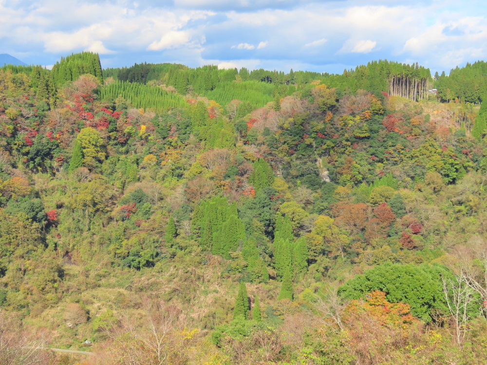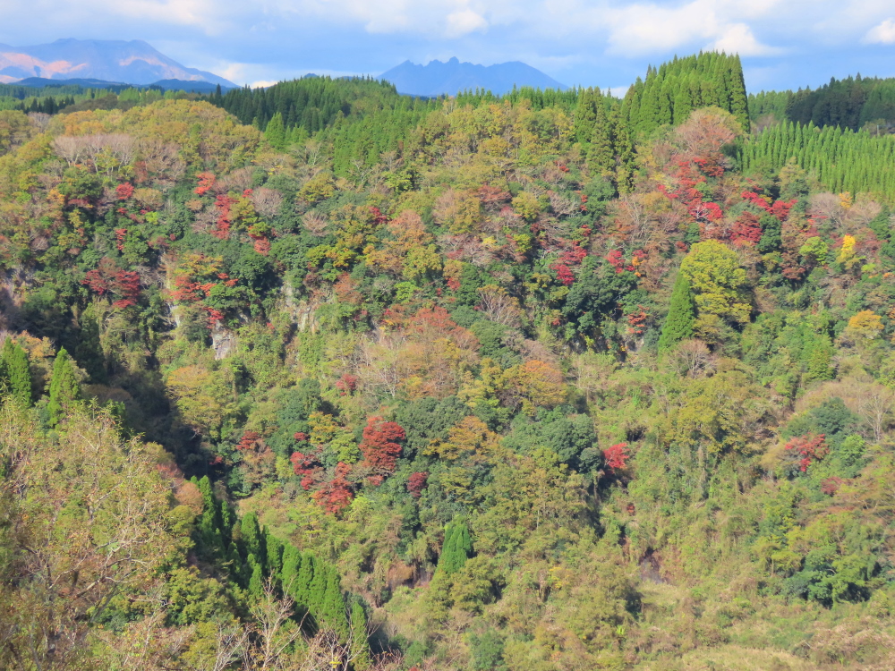 展望台から一望した峡谷。訪れた時は紅葉が少し色褪せてしまっていたのが残念だったが、晩秋と初冬の境目、紅葉景色と冬枯れの景色が共に写る様子はなかなか見れないのかもしれない。 地形は最下層が6500万年前の白亜紀の地層で、最も新しい最上層であっても約9万年前の阿蘇火砕流堆積物となっていて、この雄大な峡谷がどれだけ長い年月をかけて形成されたかがうかがえる。