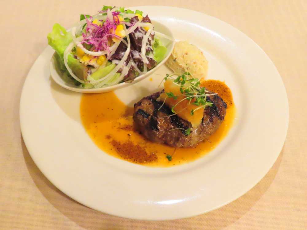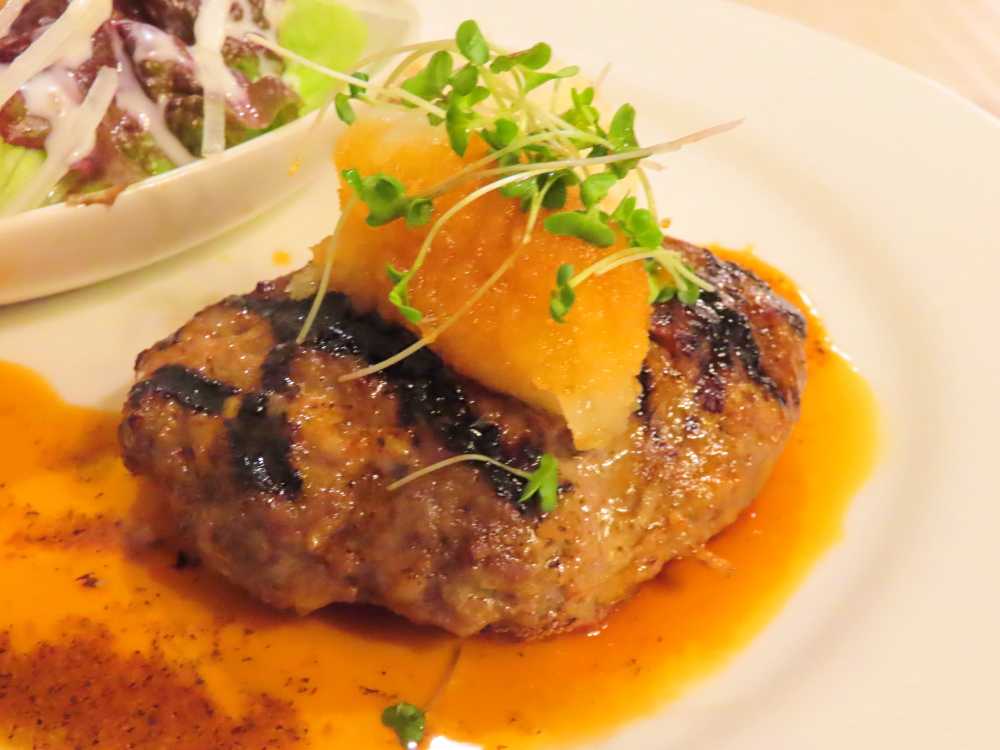 自家製ぽんずハンバーグ。 黒毛和牛の手作りハンバーグとなっていて、ソースはデミグラスソース、自家製ぽんず、てりやきソースの中から選べるようになっている。