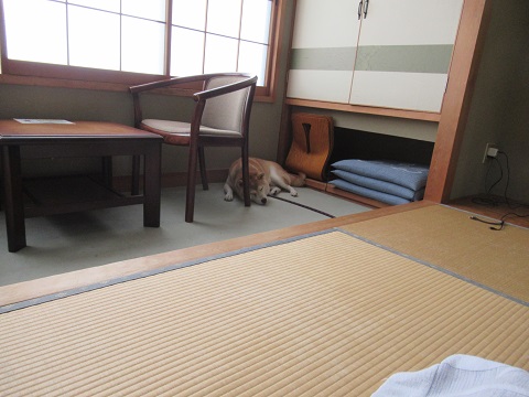 和朝食旅行記の続きです。ゴンはまだ2度寝中なのですが、そろそろ朝食の時間です。ゴンを起こして朝食会場へ行きましょう。朝食会場には仲居さんが案内してくれます。別の客室の一室が朝食会場でした。こんな風に用意されていました。ゴンも一緒に朝食会場へ。お鍋の中は具だくさんのお味噌汁。食べている間、ゴンはおとなしかったです。部屋に戻ると、またウトウト。でももうチェックアウトの時間だよ。お宿をチェックアウトです。今回の宿泊料金ですが、1泊朝食付18000円のプランでした。ブロック割で9000円引き、旅行サイトのクーポンで2000円引き、お支払は7000円でした。でも地域応援クーポンを4000円分いただけたので、実質3000円でのお泊りでした。では次に向かいます。一旦ここまで。午後に続きます。