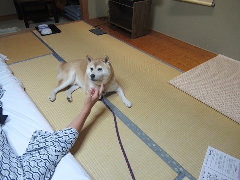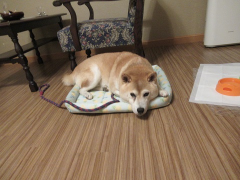 ご就寝~朝散歩旅行記の続きです。夜のご様子。お父さんのそばから離れないものだから、結局、広縁のところに置いてあったベッドをお父さんの布団の隣に移動。軽く夜散歩に行き、寝る前のガム。布団に乗らないようにリードをテーブルに固定するつもりだったんだけど、解っているのか、乗るような様子はないので、そのままに。マイベッドでグッスリでした。翌日の朝です。ゴンお散歩だよ~。ゴンは寝ていたのを起こされてちょっと不機嫌顔。お宿周辺をお散歩です。少し歩いてからドッグランへ。ドッグランだと勝手に動いてオシッコしてくれるので楽です。お散歩の後は2度寝開始。なぜかこんな隅っこへ。まぁ布団の上じゃないので良しとしましょう。旅行記は今日はここまで。明日に続きます。