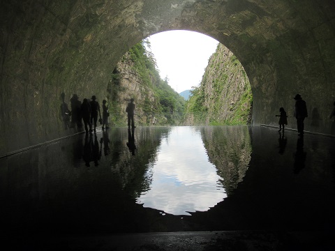 清津峡トンネル旅行記の続きです。清津峡トンネルを観光中です。3か所の写真スポットを廻り、いよいよ4か所目、メインのパノラマステーションです。トンネルの手前に水が溜められていて、そこに渓谷の景色が反射して見えます。ゴンを入れて。水の中を通り、ゴンとお父さんがトンネル口の方へ。水嫌いのゴン、最初は水に入るのを嫌がったけど、お父さんに引っ張られてついて行きました。ゴンとお父さんも水に反射して撮れます。いい感じに撮れました。アップで。私はスニーカーを履いていて、靴を濡らしたくなかったのでトンネル口の方には行かなかったけど、トンネル口から見た景色が素晴らしいそうです。猫ちゃんが写真を撮っていたので、撮らせてもらいました。清津峡渓谷トンネルの説明。750mを往復し、1500m、約1時間の観光でした。4か所のスポットの説明。トンネルから出てきました。景色を撮りながら車に戻ります。以上、清津峡の観光でした。とっても綺麗な景色で感動でした。次は新潟でのお宿に向かいます。続きは午後です。