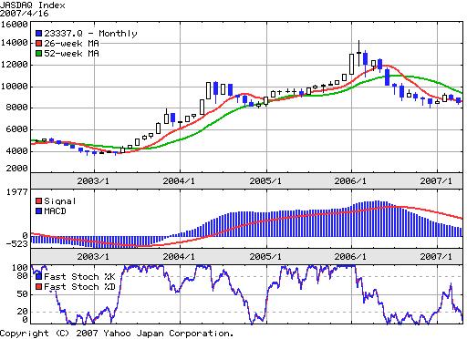 昨年のJASDAQ指数の最安値は11月21日に記録した80.82ポイントでしたが、今日の終値で80.80ポイントと下回ってしまいましたね。ここでJASDAQ指数の5年チャートを見ると、2003年後半のレジスタンスライン、2004年後半のサポートライン、そして2006年後半のサポートラインがだいたい80ポイントの価格帯で形成されている事が分かります。『チャートなんてオカルトだから役に立たない』なんておっしゃる方も多いでしょうが、サポート・レジスタンスラインは人間の集合体の記憶力そのものだと考える事ができますので、昨年の安値を抜けて80ポイントを割り込むと需給面でかなり厳しい展開となりそうです!!!抜けてしまうと80ポイントが分厚い壁となって立ちはだかり、それを超えるには相当の期間(2年以上か!??)かかるかもしれないと覚悟しておいた方がよさそうです。そういう意味では今週~来週にかけてが剣ヶ峰となりそうですね。いくらバリュー株でも理不尽な下げ相場がやって来る事もありますので、取り敢えず防御を固めておいて過度な暴落場面のみでのリバウンド狙いや上昇相場の初動でのみ攻撃に転じるくらいにした方が良さそうですね。